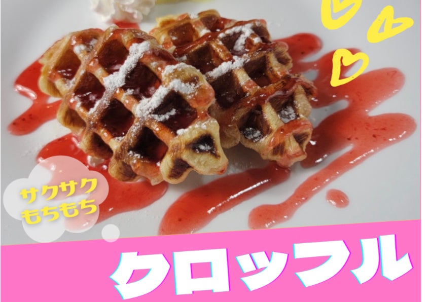 まにぽぽで人気急上昇中、キッチンカーでの提供では初登場のクロッフル。外はサクッ、中はモチモチの韓国次世代スイーツです。4種類のソースを選べ、どのソースも生地にマッチします。