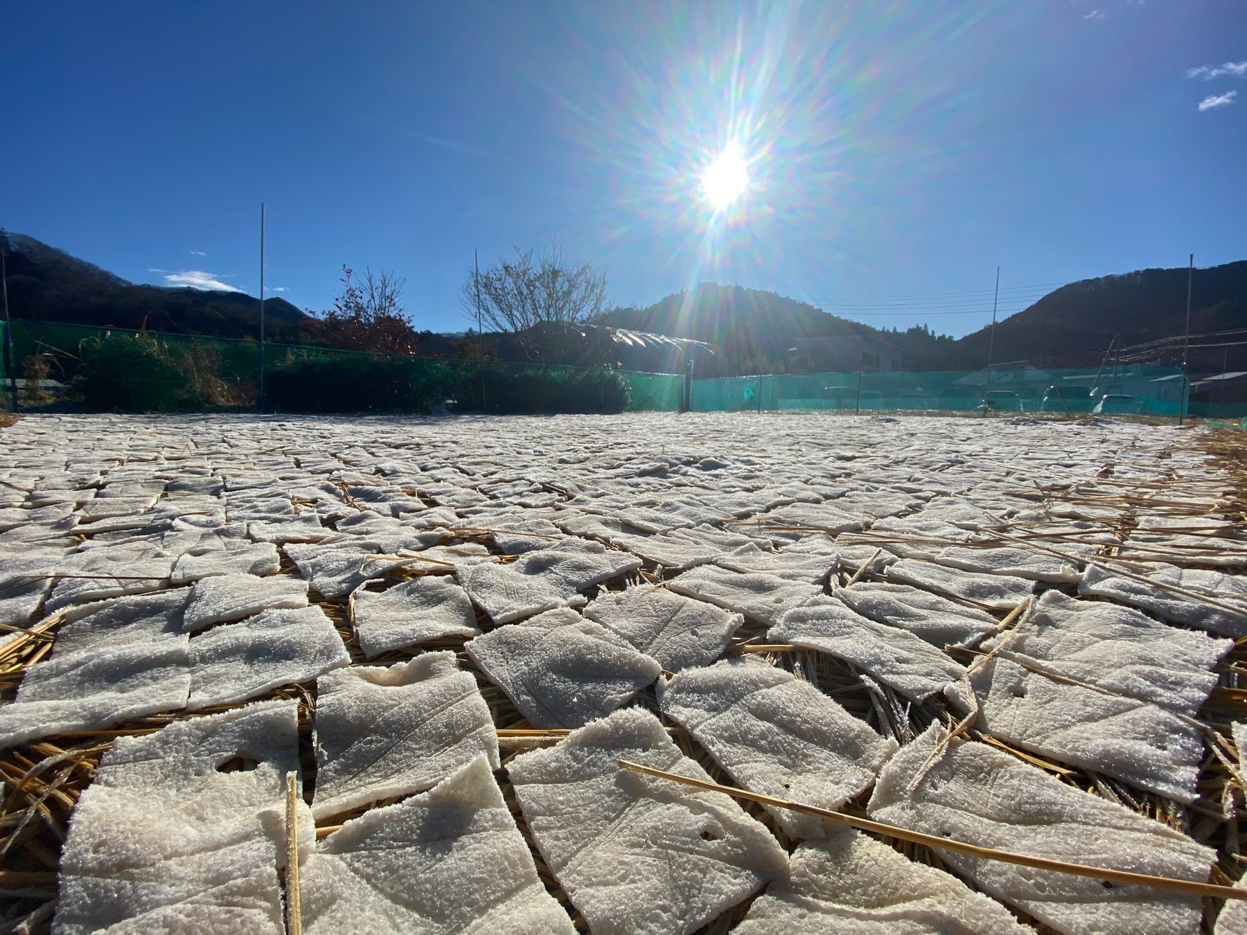 こんにゃく発祥の地 大子町では、 冬の12月から2月の間だけ、山から吹く乾燥した冷たい風と真冬に厳しい寒さを生かして製造される凍みこんにゃくの製造作業を行います。こんにゃくを藁の上に寝かせ、夜の寒さで凍らせて、昼に溶けたこんにゃくに水をかけてまた凍らせることを繰り返し、凍みこんにゃくは製造されます。自然を生かした伝統的工程を活かし、最先端の冷凍技術を用いて作られた、凍みこんにゃくスポンジ「つるりん ころりん」は、きめの細かさや肌への優しさモチモチ感が格別です。