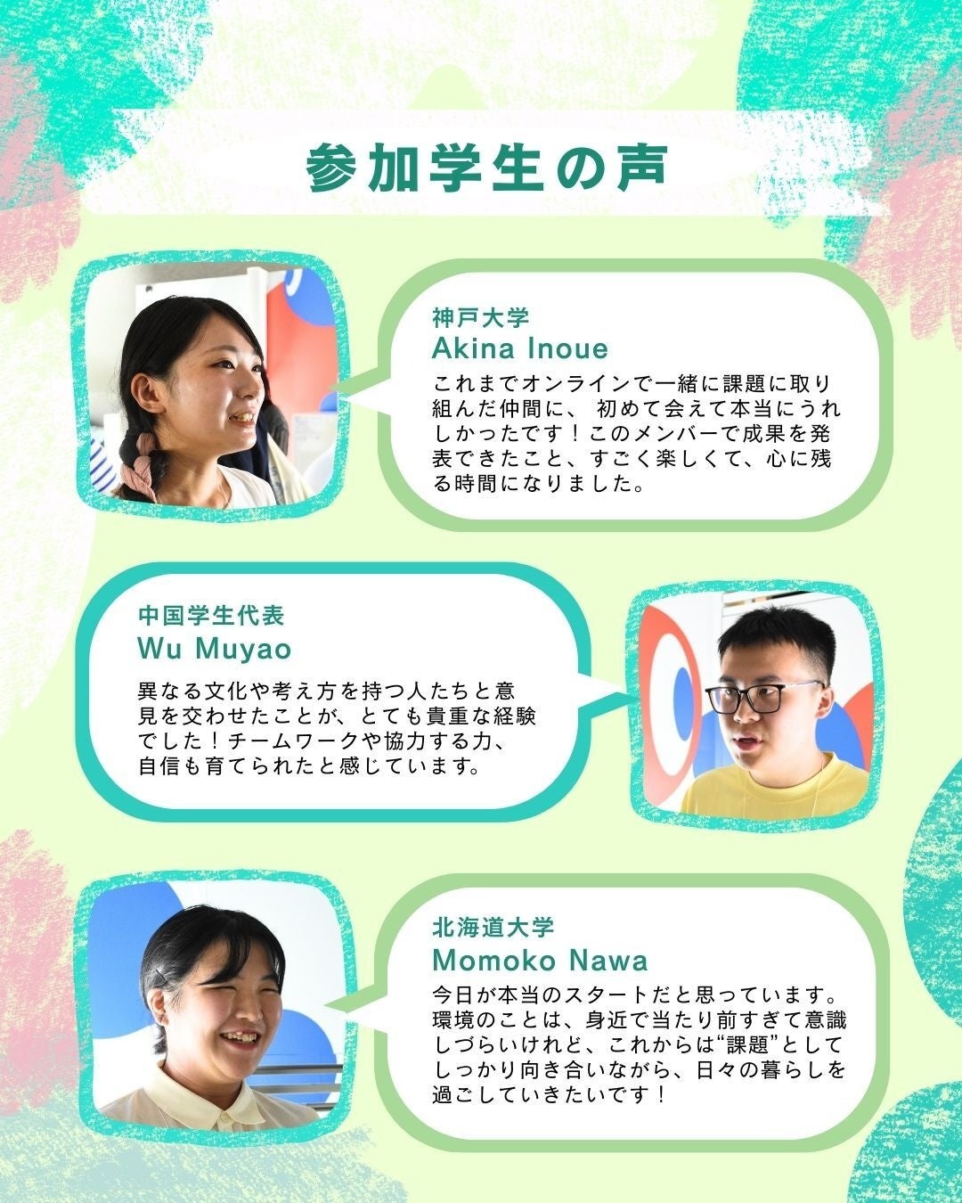 地球の未来を考える上で必要な思考プロセスを勉強でき非常に有意義な機会になりました。また、海外の学生と協力して一つの課題に向き合う時間はとても楽しかったです!この度は非常に貴重な機会をくださりありがとうございました。
