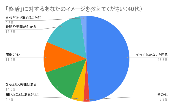 「いろいろな手間と時間が凄くかかるというイメージで、終活をするのはすごく面倒という気がします。自分としては、まだ終活をするのはもうちょっと先で良いのではないかと感じています。(時間や手間がかかる・40代 男性)」