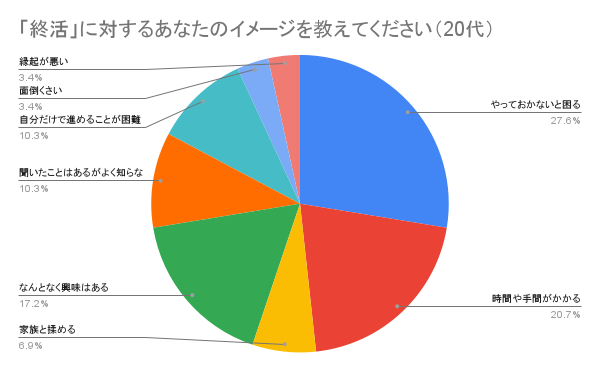「終活は周りの人のサポートあっての活動だと思う。なぜなら終活をするのは自分のためでもあるが、残される家族のためでもあるから。人間いつ死ぬかわからないし、どうやって死ぬかもわからないのであまり意味がないと思う。(聞いたことはあるがよく知らない・20代 女性)」