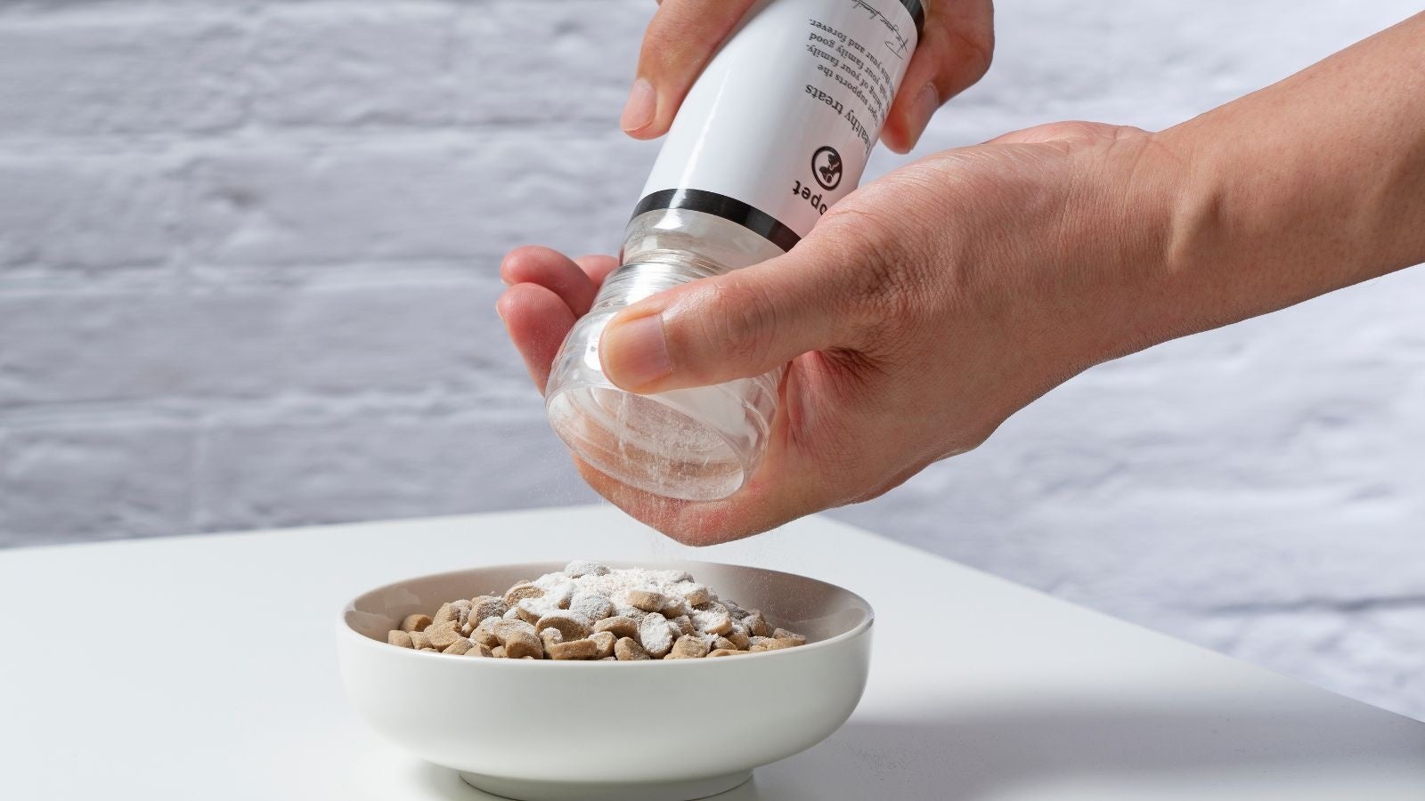 愛犬・愛猫のデンタルケアに新しい選択肢を与える「お口のふりかけ」は、新感覚の専用ミルを使って1日3秒いつものごはんにかけるだけ。しっかり噛んで歯垢を抑えお口のニオイを軽減します。