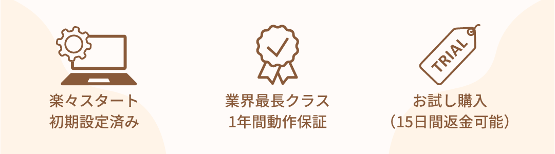 パソコン操作に不安のある方でも快適にご利用いただけるよう、初期設定をした状態でお届けします。また、再生パソコンを初めて購入する方も安心していただけるよう、1年間の動作保証や15日間の返金保証付きです。