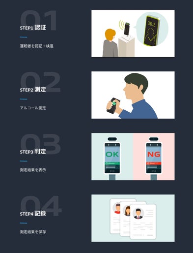 ゼネチェッカーは運転者の酒気帯びの有無の確認を次の4つのステップで素早く簡単に行います。