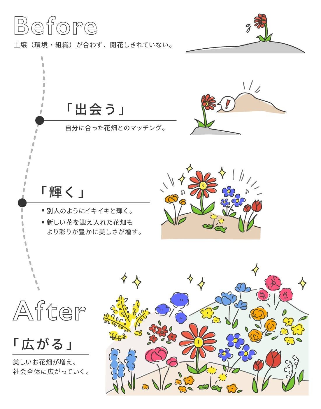 当オウンドメディアでソーシャルグッドなキャリアについて発信をしていく事で、キャリア選択時に年収などの「条件」だけでなく、自分の「想い」、社会への「想い」にも焦点をあてて転職先を探す方が増えていく事を目指します。そのような転職をする事で仕事が「生きがい」と繋がり、いきいきとした人生となる方が増えていく事が私たちの目指す未来像です。