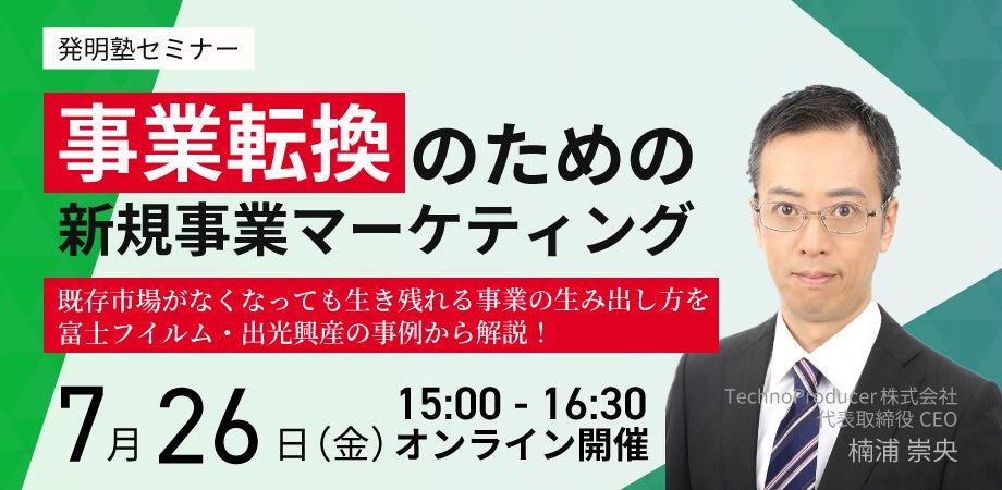TechnoProducer(テクノプロデューサー)株式会社(代表取締役:楠浦崇央)は、2024年7月26日(金)15時から「発明塾®セミナー:事業転換のための新規事業マーケティング™ ~既存市場がなくなっても生き残れる事業の生み出し方を富士フイルム・出光興産の事例から解説!」を開催致します。