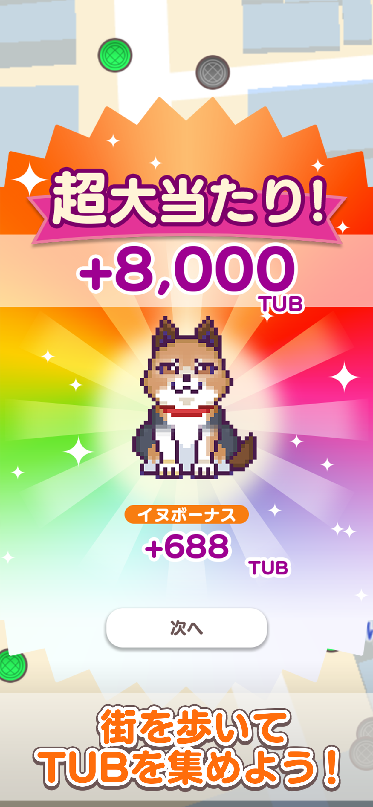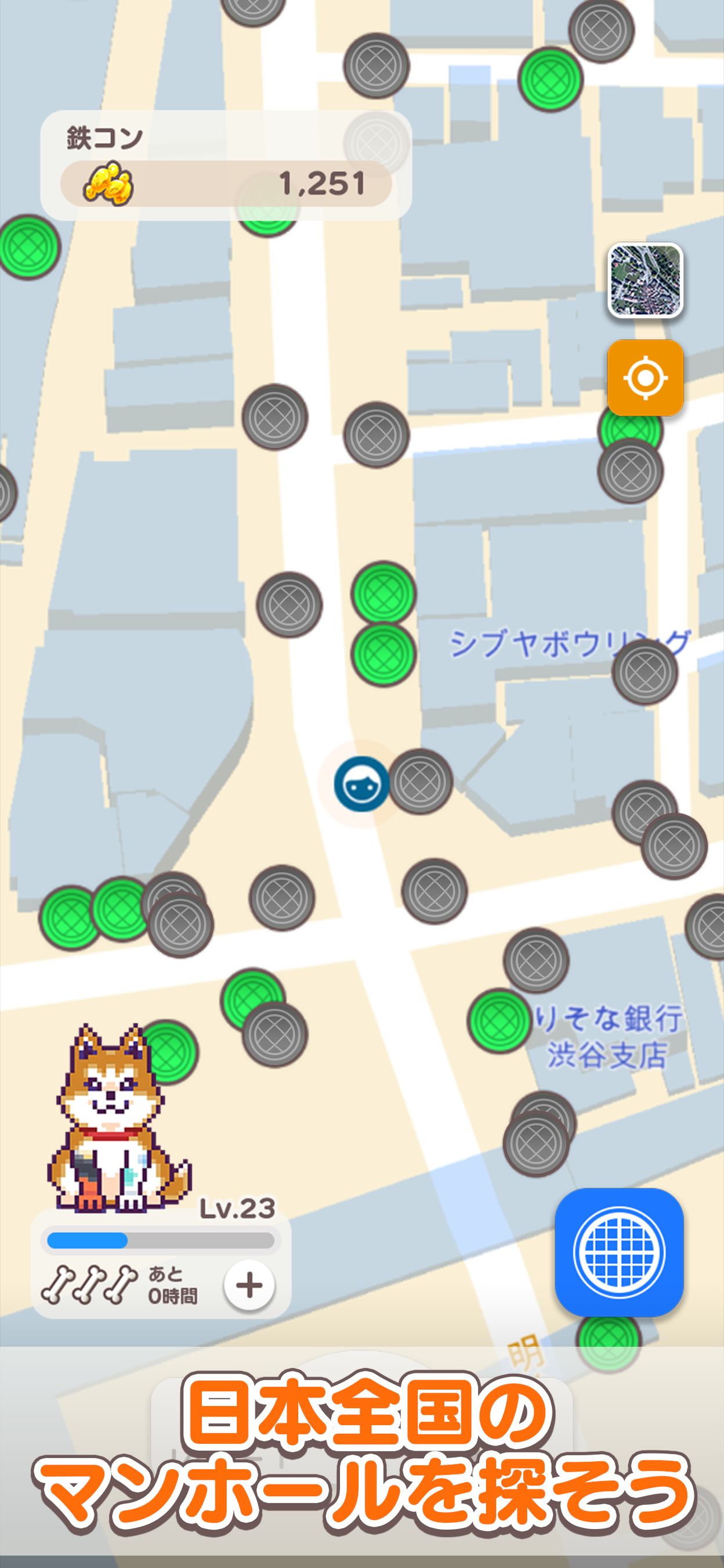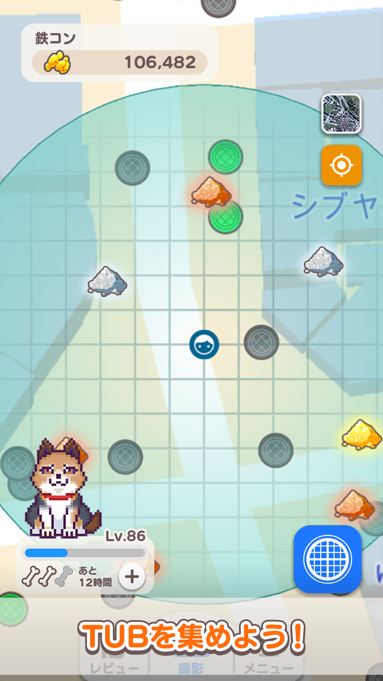 また、アプリ版では、さらに位置情報ゲーム要素を強化し、マンホールを探すのとあわせレーダーで周囲を探り、相棒のイヌとともに街中の至る所に埋まっている「砂金」を掘り出してTUB(つぶ)と呼ばれるポイントを獲得していくこともできます。