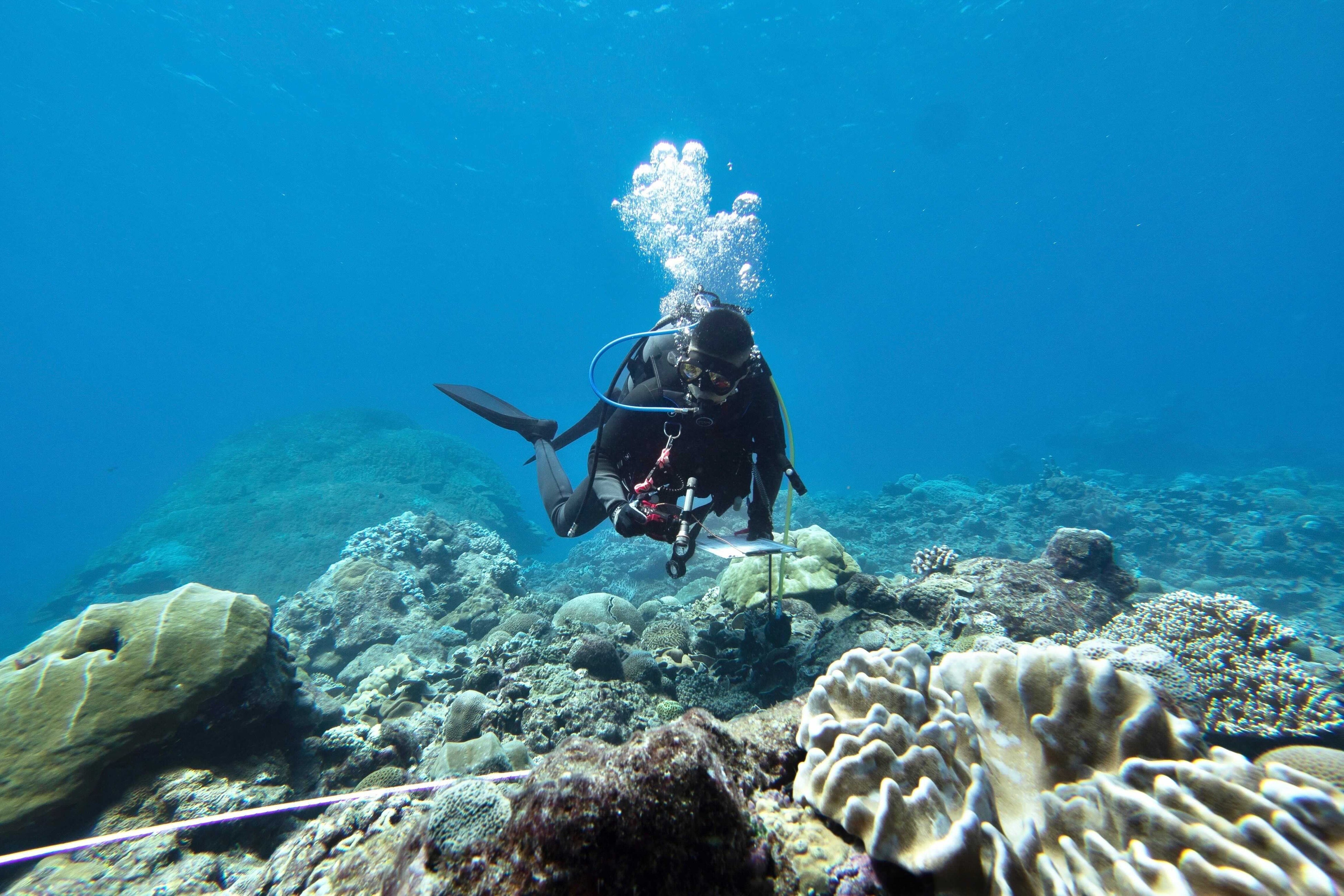 調査は水深約5メートルの浅場と約10メートルの深場の2地点で魚類、無脊椎生物、底質の3項目に分けられて実施されます。魚類、無脊椎生物は商用やダイビングなどの観光利用が考えられる生物種をカウントし、底質の調査では造礁サンゴやソフトコーラル、岩や砂地など海底の構成物の割合を出し、造礁サンゴに関しては白化の割合の数値も計算しました。