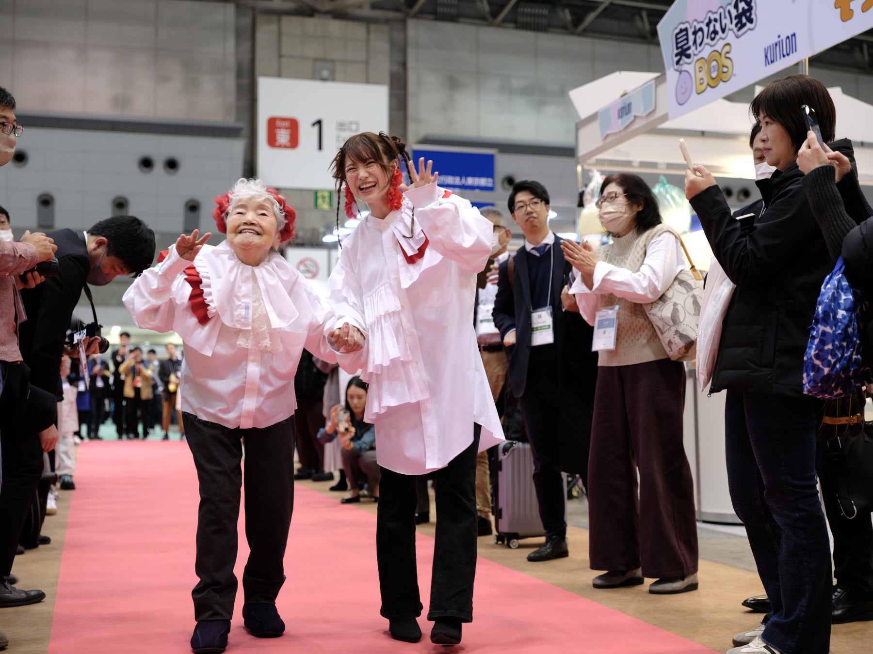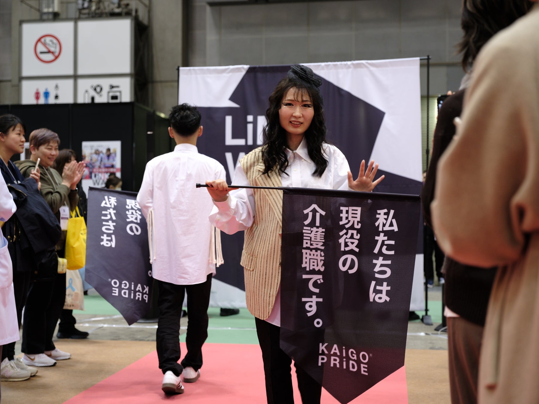 現役の介護職と高齢者が華やかなファッションに身を包み、ビッグサイト内のレッドカーペットを歩きました。会場には多くのビジネスパーソンが集まり、拍手を送りました。 これらの取り組みを通じて、介護の魅力や可能性が広く伝えられ、多くの人々が介護の未来について考える機会となりました。企業との連携を深め、業界全体のリブランディングを推進するための新たな試みとなりました。