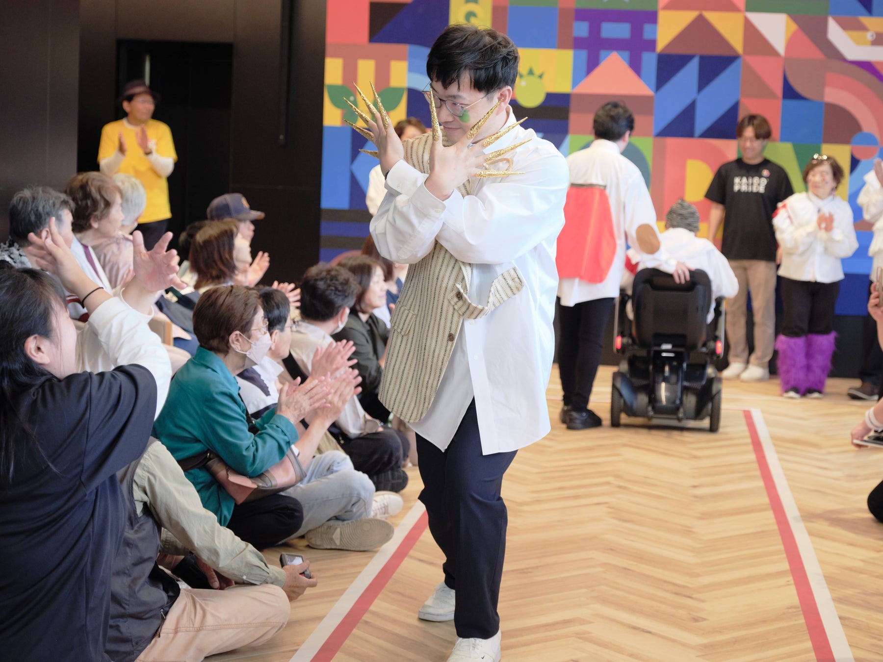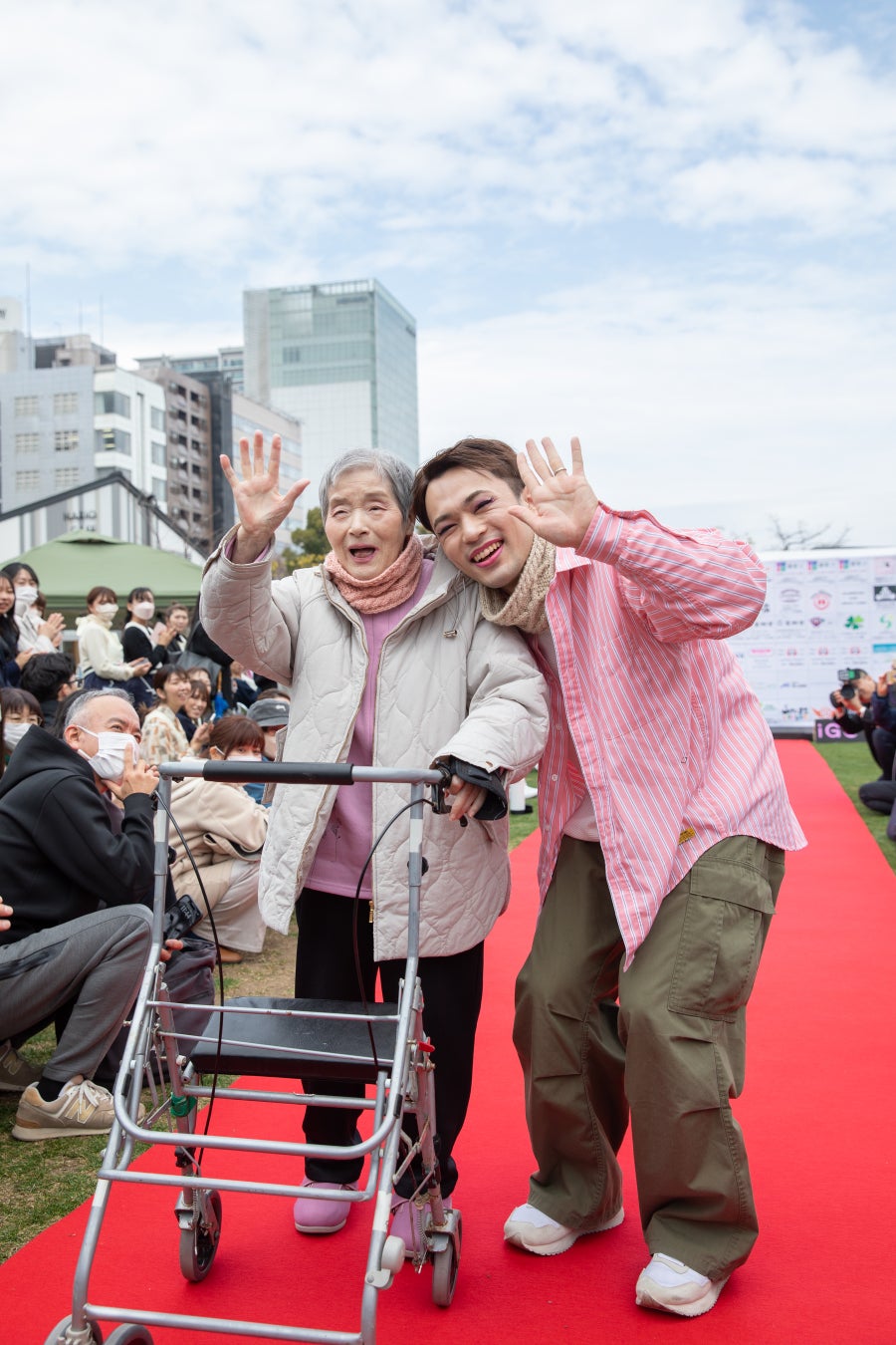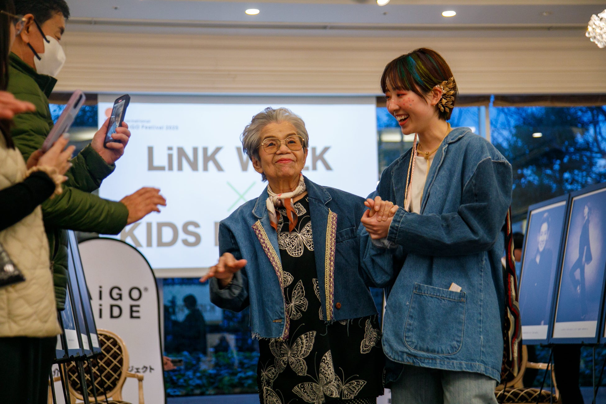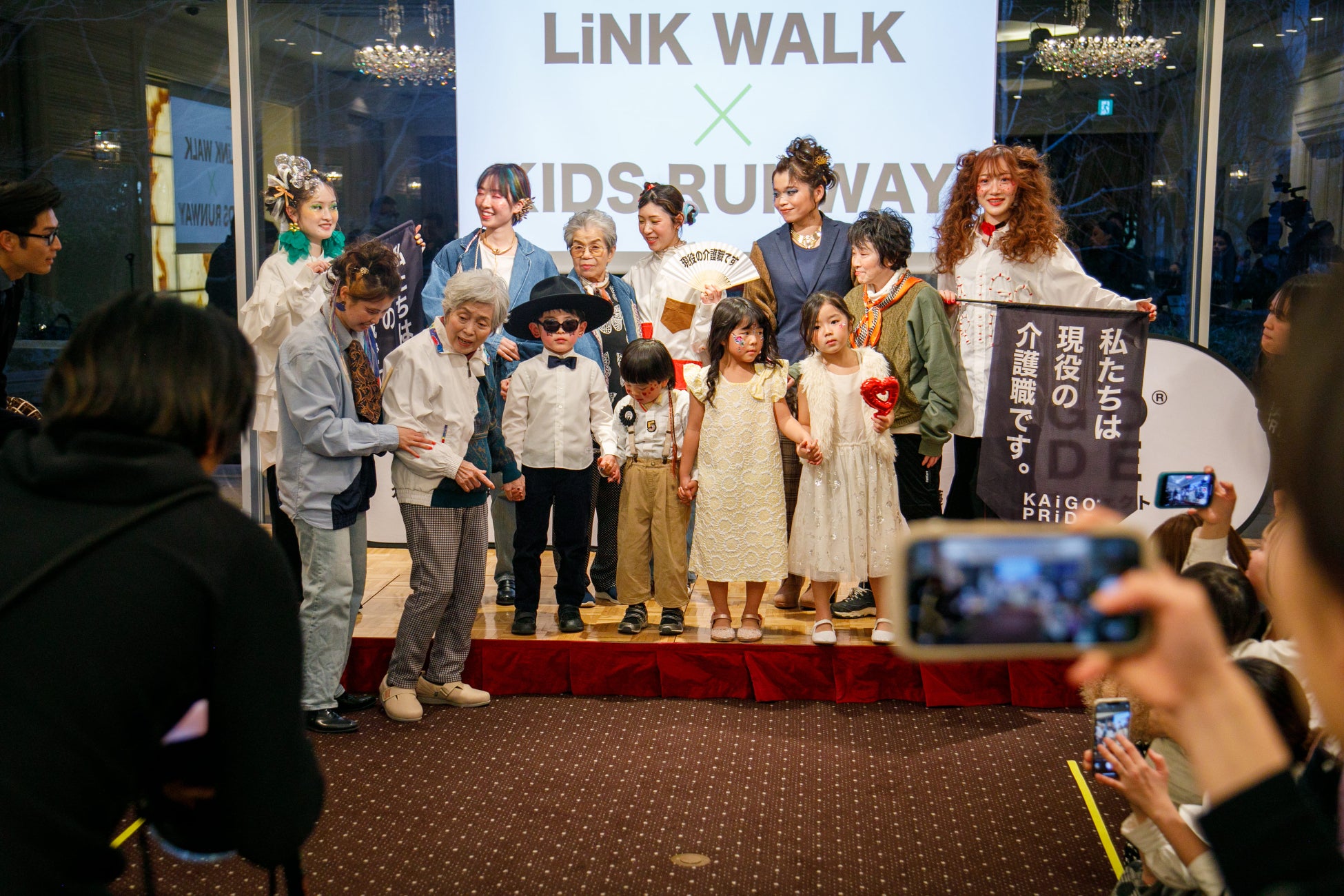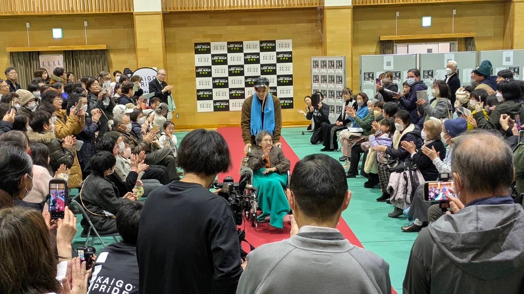 LiNK WALKでは、参加者一人ひとりが思い思いのスタイルでランウェイを歩き、介護職員の誇りや温かい心遣いが表現されました。 高齢の方々、そして子どもたちが一緒にランウェイを歩く特別なステージとなりまり、世代を超えた共演が、介護に対するポジティブなイメージを伝える大きな一歩となりました。 手を取り合いながら歩く姿に観客は温かい拍手を送り、会場は感動に包まれました。