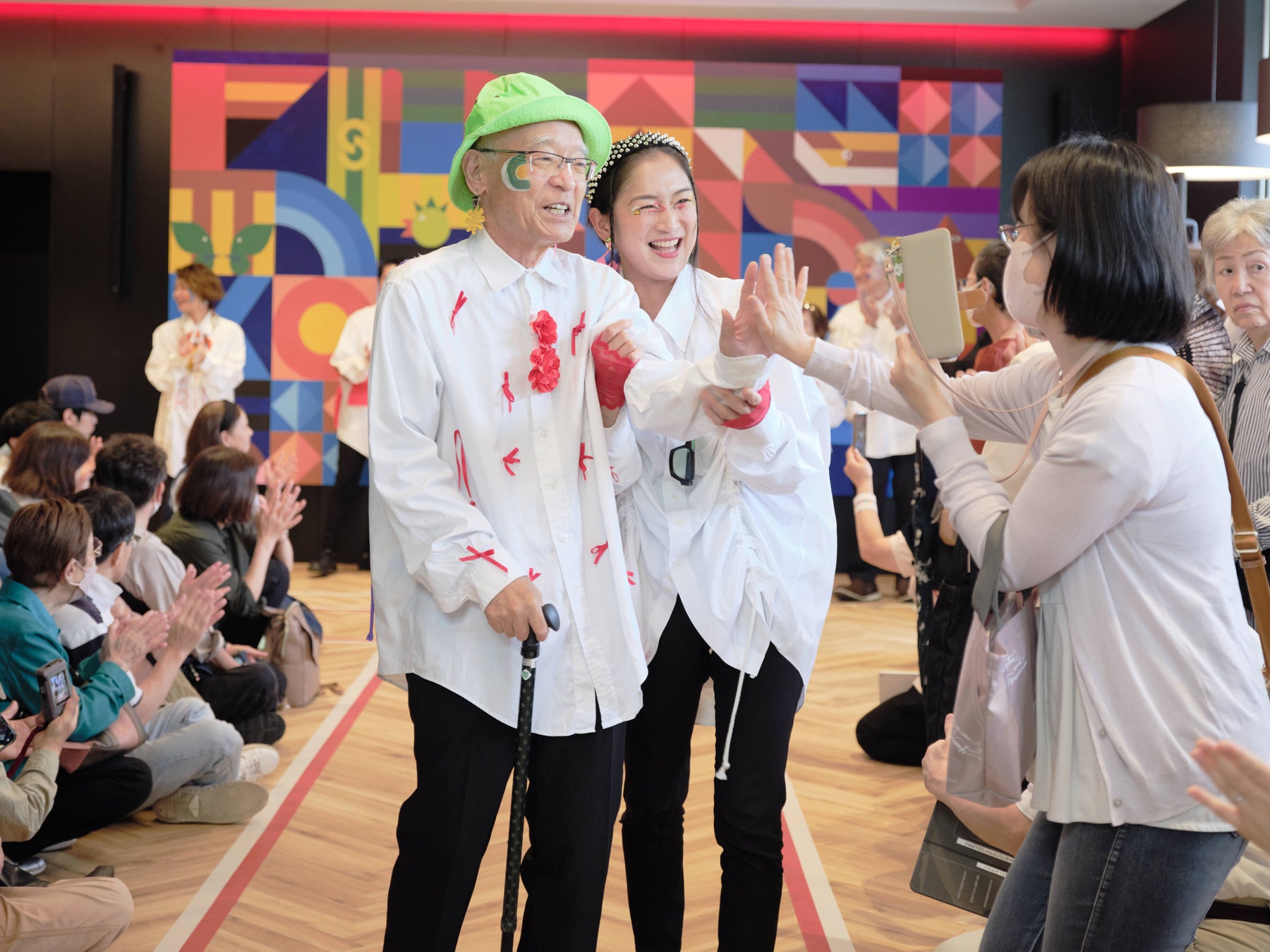 プレオープン記念ということもあり、施設に関心を持つ多くの地域の方や地元小学生らがイベントに参加。真新しい館内には地域住民と共に描き上げたインパクトウォールが掲げられ、訪れた人たちの目を引きました。そのインパクトウォールを背にするようにランウェイを歩き始めたモデルたちは、いずれも地域の支援者と高齢者。ポーズを取りながら歩くモデルたちは、観客からの声援を浴びて目を細めていました。後半にはインパクトウォールをモチーフにしたフェイスペイントを施した小学生らの「飛び入り」もあり、本当の意味で世代も背景も超えた”歩み”となりました。