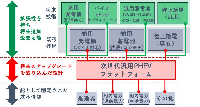 既存船と実質同等程度の費用で環境性能に優れた船舶建造が可能。 港湾内・着岸中(アイドリングストップ)におけるCO2のゼロエミを実現し、将来的に低環境負荷型発電機(水素燃料電池やバイオ・合成燃料等の利用)に換装することで、完全ゼロエミにも対応する。 コンテナ電池に充電された再エネ電力の利用で、運航時のCO2排出削減だけでなく、ライフサイクル全体(燃料の採掘・製造・使用)におけるゼロエミを実現。 |