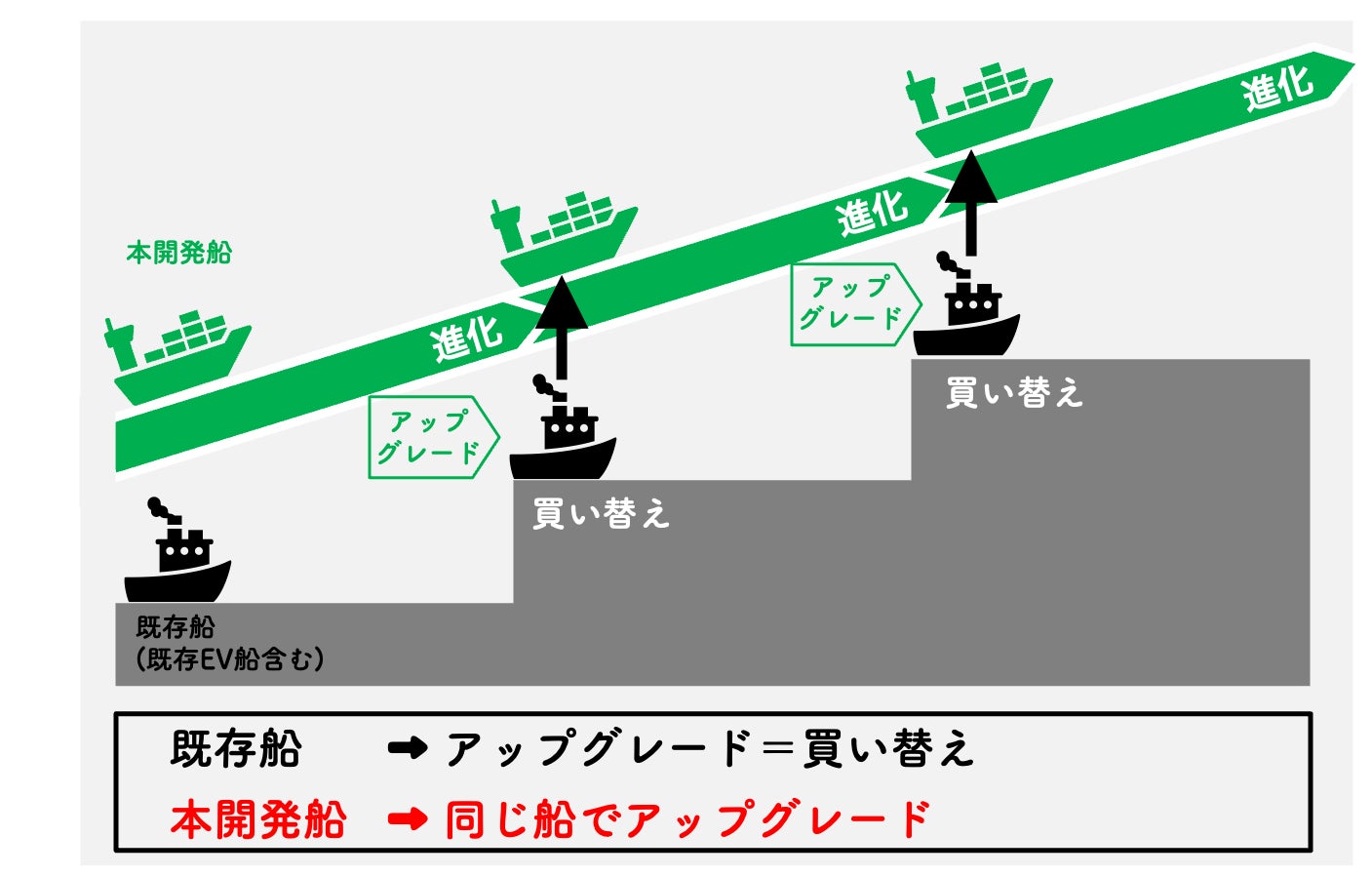 『ナビゲーションシステム』『EVパワートレイン』『EV船最適形状』『積載効率向上』『運航情報デジタル化』が標準化・モジュール化・自動化されることにより、船舶の建造、保有、運航、管理、配乗の全てにおいて 標準化の恩恵を享受することが可能となる。 また、これらの標準システムは、使われれば使われるほど、隻数が増えれば増えるほど、データの蓄積によって進化し、次世代EV船は、より安全に、より効率的に、より環境及び乗組員に優しくなる。 |