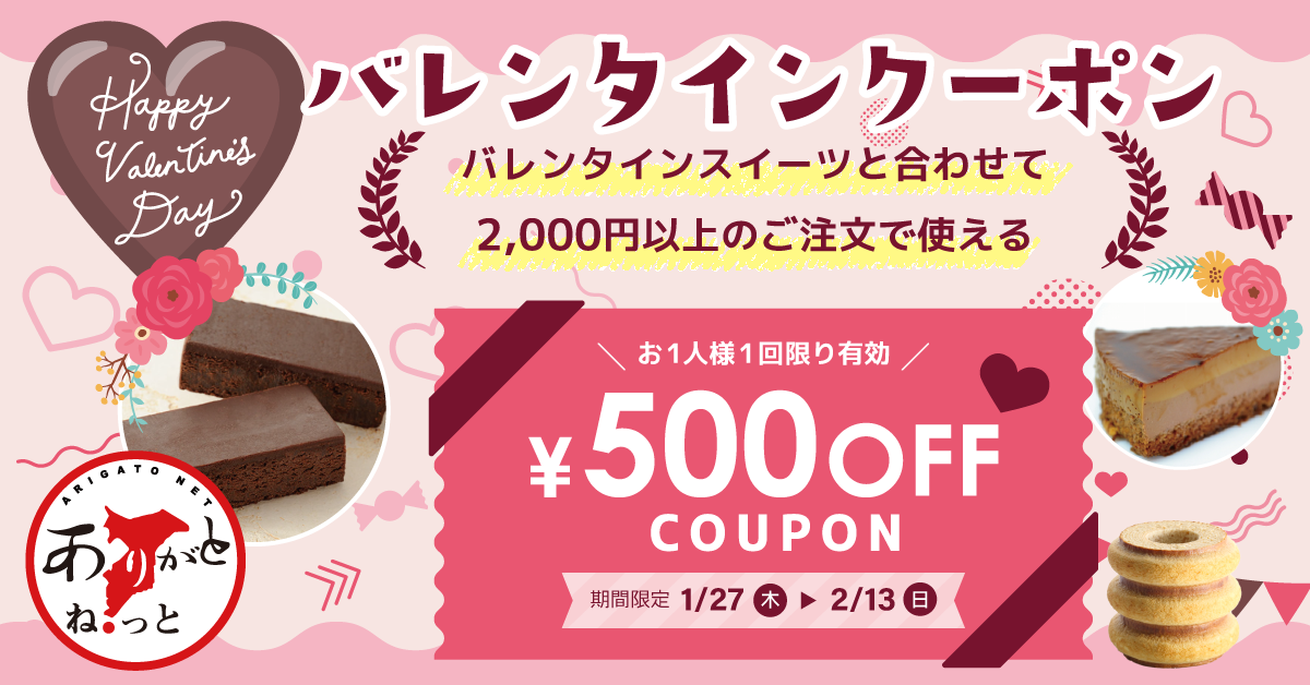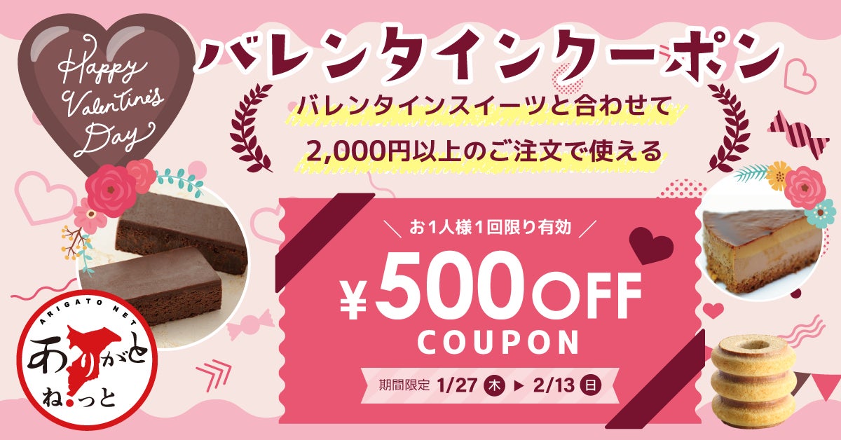 【期間限定】1/27(木)9:00~2/13(日)23:59 「ありがとねっと」でバレンタイン スイーツを1つでも購入すると500円OFFクーポンが使える!レビュー投稿でさらにおトク!