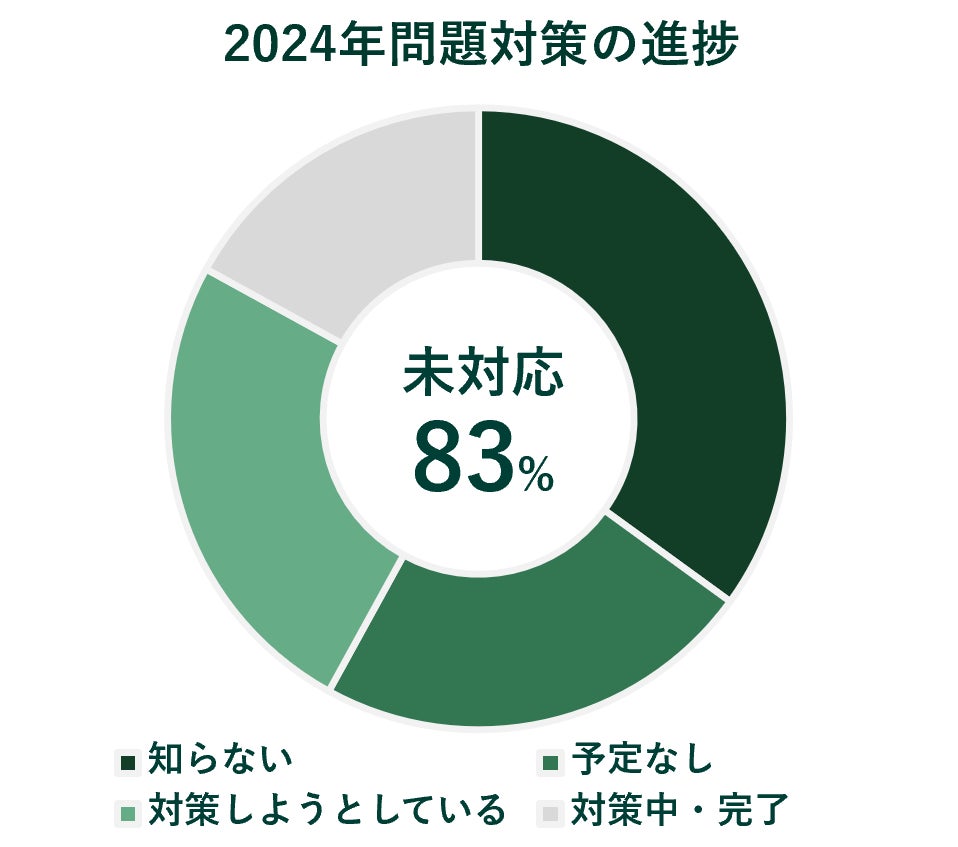 当社・クラフトバンク総研が2023年8月に実施した調査では、2024年問題に対し、2023年8月時点で83%の企業が未対応であり、時間外労働の罰則付き上限規制の適用まで残すところ約半年となった現在も、工事会社においてはいまだ対策を講じられていない状況が続いています。