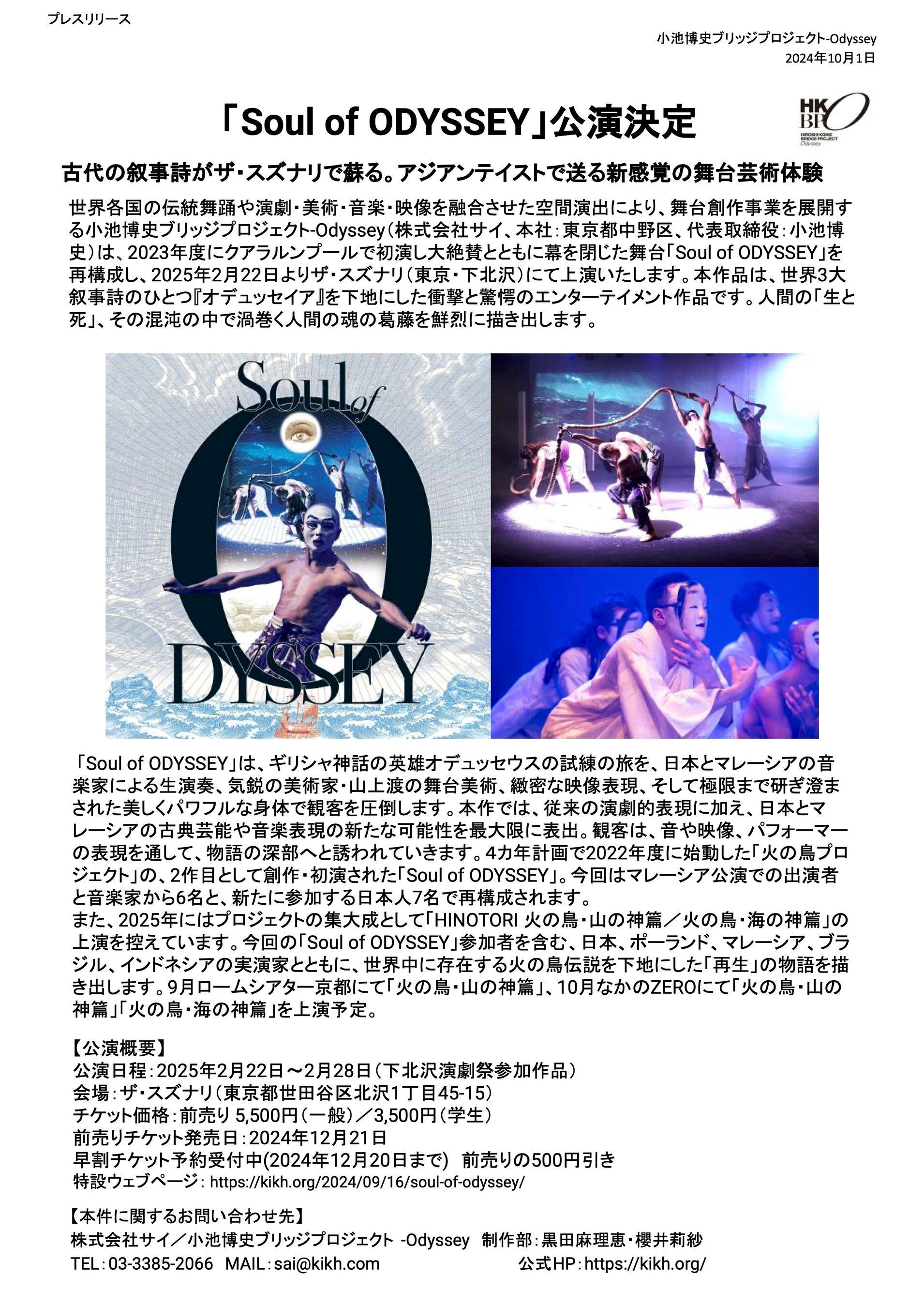 世界各国の伝統舞踊や演劇・美術・音楽・映像を融合させた空間演出により、舞台創作事業を展開する小池博史ブリッジプロジェクト-Odyssey(株式会社サイ、本社:東京都中野区、代表取締役:小池博史)は、2023年度にクアラルンプールで初演し大絶賛とともに幕を閉じた舞台「Soul of ODYSSEY」を再構成し、2025年2月22日よりザ・スズナリ(東京・下北沢)にて上演いたします。本作品は、世界3大叙事詩のひとつ『オデュッセイア』を下地にした、衝撃と驚愕のエンターテイメント作品です。人間の「生と死」、その混沌の中で渦巻く人間の魂の葛藤を鮮烈に描き出します。