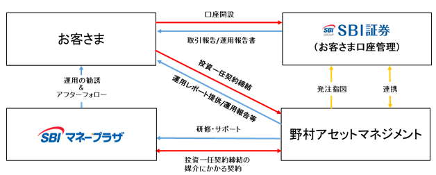 投資一任契約締結後、野村アセットマネジメントの指図により、お客さまのSBI証券口座で複数の投資信託の買付を行います。