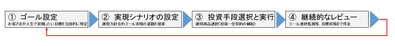 ゴールベースアプローチとは、お客さまとその家族の「ゴール」(人生の目標や深刻な課題・苦悩等の総称)をプランニング等を通じて包括的に特定した上で、その実現のために必要かつ許容可能なリスク水準の中長期分散投資による投資を実行し、継続的なレビューによりゴールへの進捗や追加ゴールの設定等を必ず行うアプローチです。以下の4つのプロセスで成り立っています。