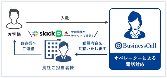会社や事務所、または個人事業主へかかってくる電話を一次対応し、担当者からの折り返しをご案内するサービスです。対応した内容はリアルタイムで報告、詳細は専用管理画面にて確認できます。