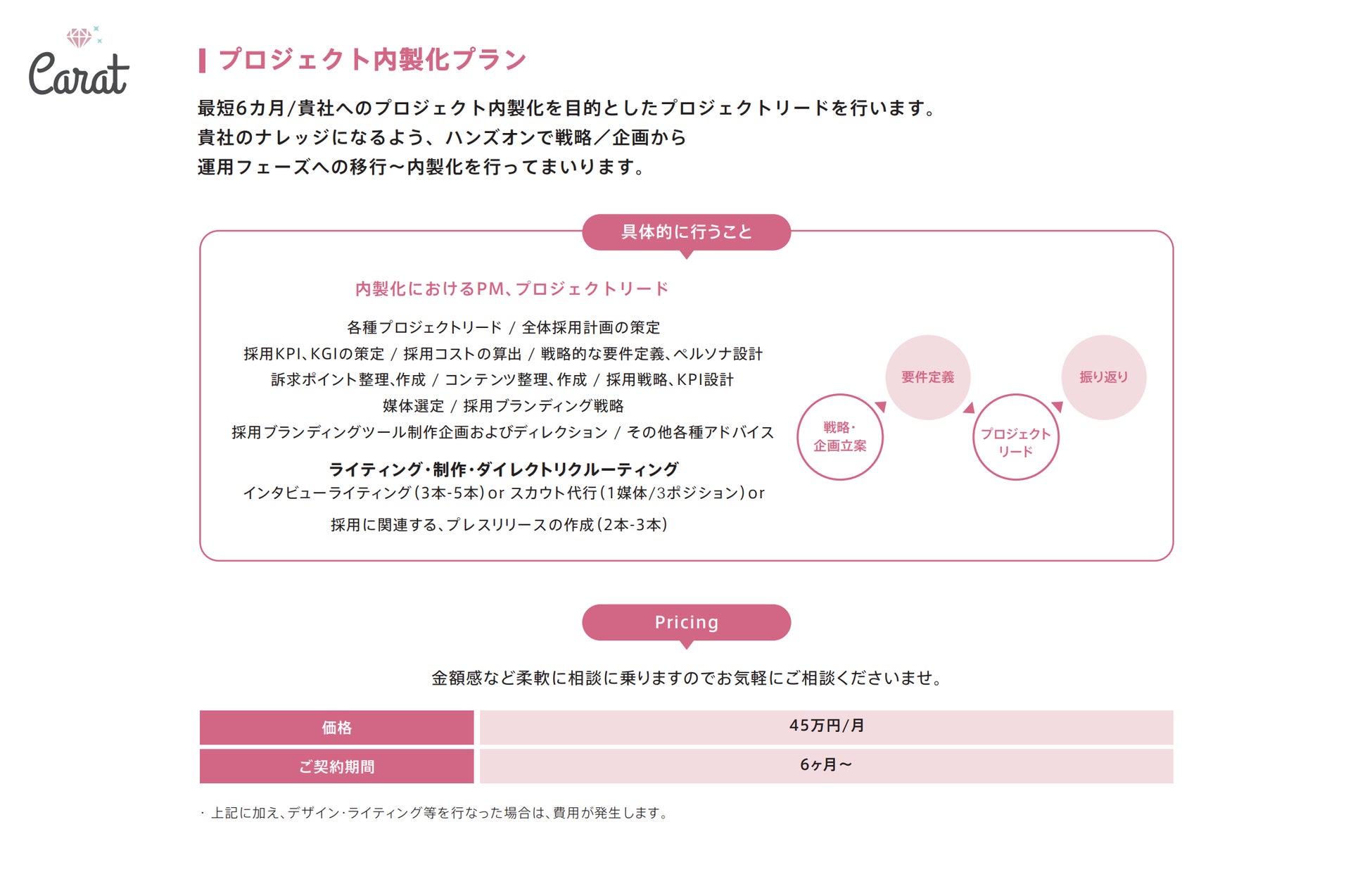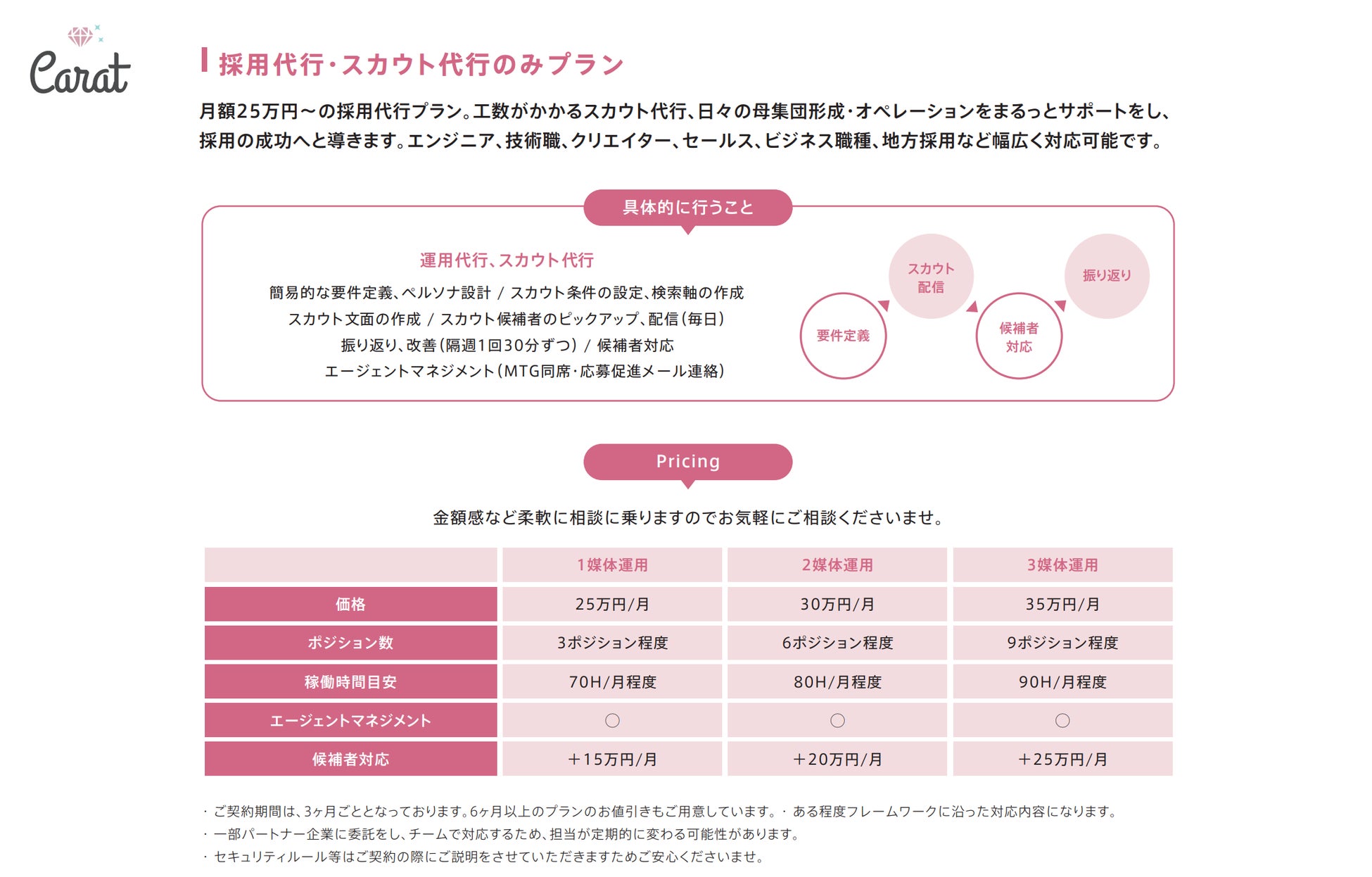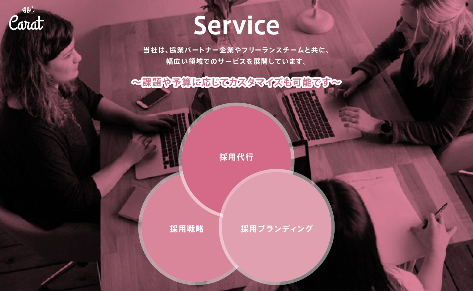 Carat株式会社(本社:東京都渋谷区、代表取締役社長:中屋まり、以下「Carat」)は、"採用に成功するチーム"を作り上げることを強みとしております。最短6ヶ月間で貴社に"採用チーム"を作り上げる内製化プランを軸とし、スカウト配信代行・採用代行・制作までワンストップで対応しています。特に採用広報領域においては、第2創業フェーズの企業様のリブランディング戦略/企画や制作〜運用面においてはのべ200以上のプロジェクトを進行してまいりました。