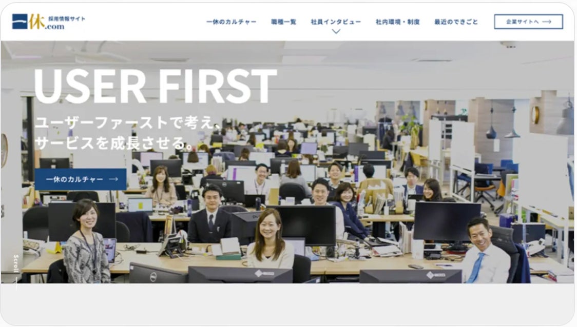 高級ホテルや旅館、レストランなどの予約サービスを提供している、株式会社一休の採用情報サイトデザインを担当しました。ユーザーファーストによる事業成長に取り組む一休の働く人たちを主軸にサイトを設計。ファーストビューでは実際のオフィスの全景を写し出し、ロゴのキーカラーである紺や金のほか、赤を取り入れ、サービスを支える「人」の熱量を表現しました。