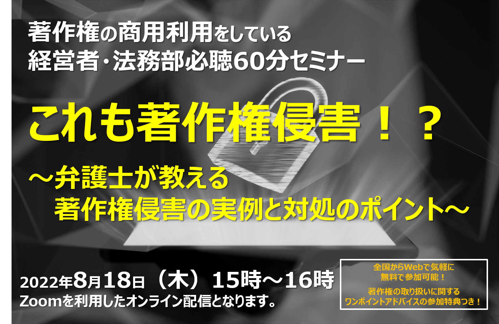 企業法務分野に精通した弁護士法人京都総合法律事務所は「これも著作権侵害!?~弁護士が教える著作権侵害の実例と対処のポイント~」を無料・オンラインで2022年8月18日(木)に開催いたします。
