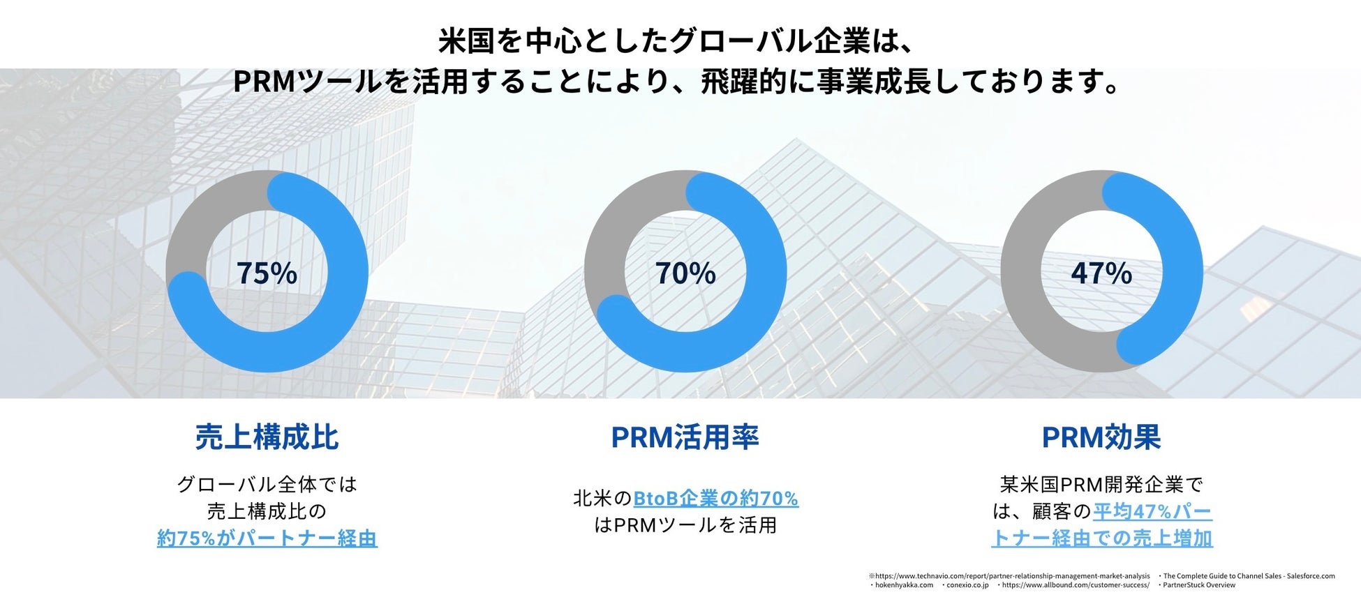 昨今、BtoBビジネスの世界ではCRMの普及とともに直販におけるデータ利活用が進み、業務の効率化・高度化が進んできております。その一方で、BtoBビジネスの売上構成比で約75%を占めるパートナービジネス(紹介/取次/卸/リセール等)において、CRMのようなテクノロジーの普及は中々進んでいないという現状がございます。ですが、米国を中心とした北米の企業ではBtoBビジネスを展開する企業の約70%がPRMツールを活用しております。日本で普及していない要因としては、日本特有の商習慣とパートナービジネスに最適化された手法やテクノロジーが存在しなかった上に、パートナーごとにコミュニケーションや情報連携方法が異なることで、業務の効率化・高度化が難しいと考えられてきたためです。