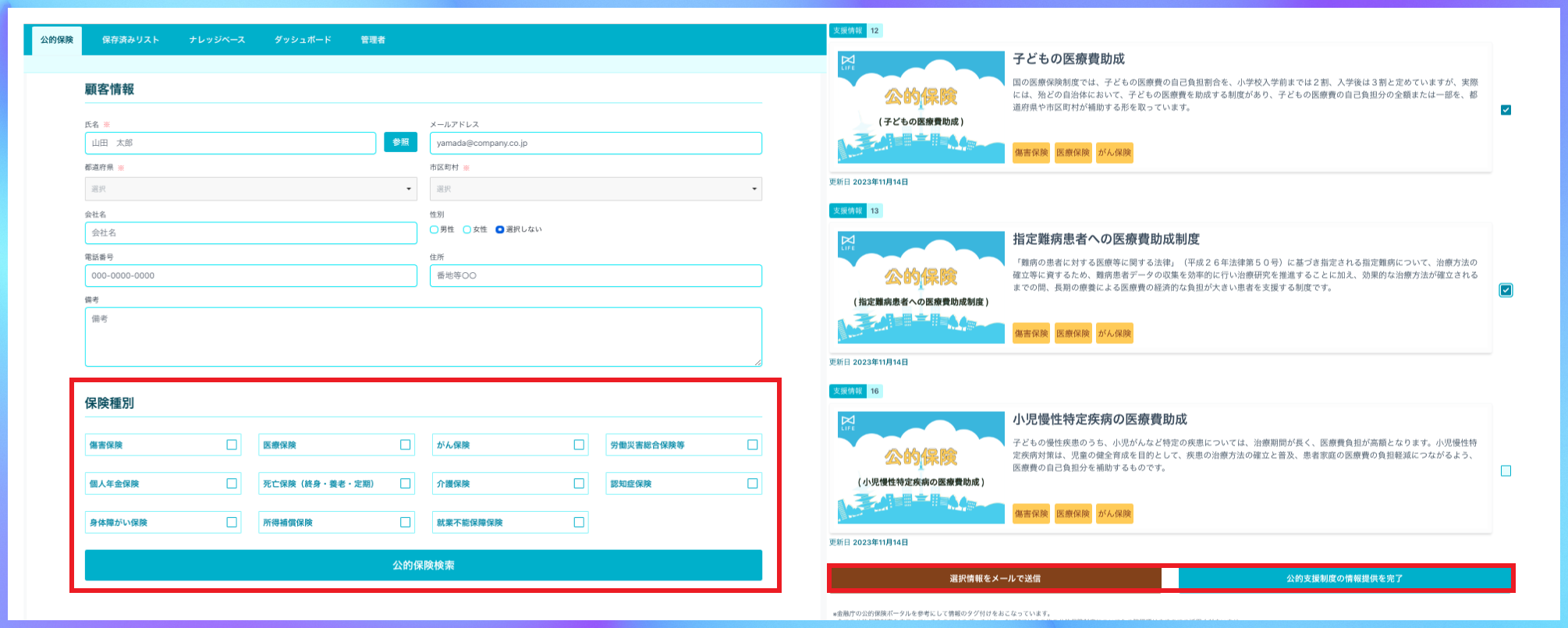 お客様の情報入力と、保険種別を選択するだけで対象の公的保険が一覧で表示されます。