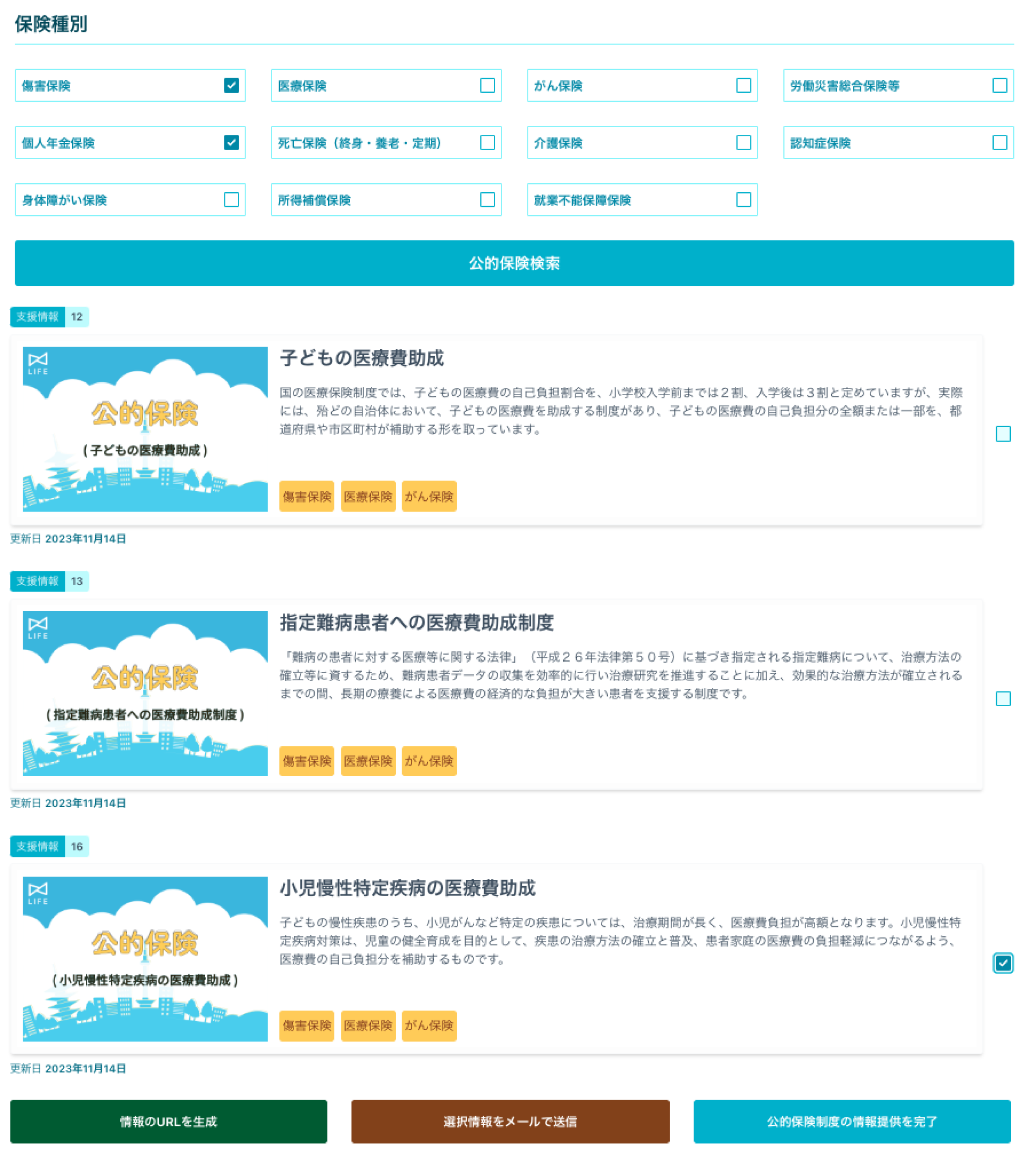その中から契約前に説明すべき、公的保険を選択し、お客様に公的保険の情報をメールで送信する事ができます。送信されたメールには、公的保険の概要を掲載したURLが記載され、URLにアクセスする事でお客様自身で公的保険の理解を深めて頂ける機能となっております。