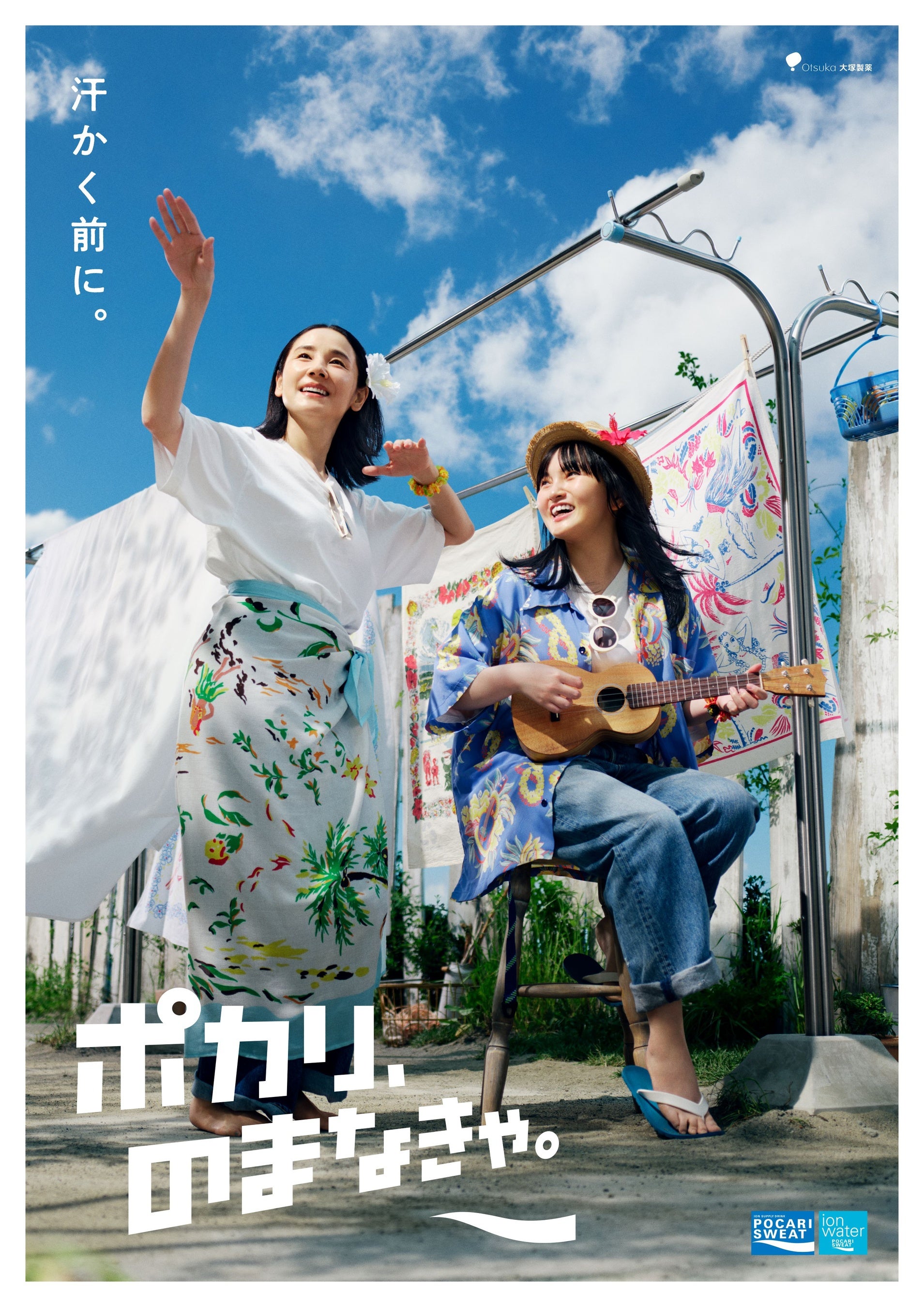 CMでは、ポカリ母娘がウクレレを奏でて歌う姿や、鈴木さんの演奏にあわせて吉田さんがフラダンス風のダンスを踊るひと幕など、夏をリラックスして過ごすふたりの姿が描かれます。