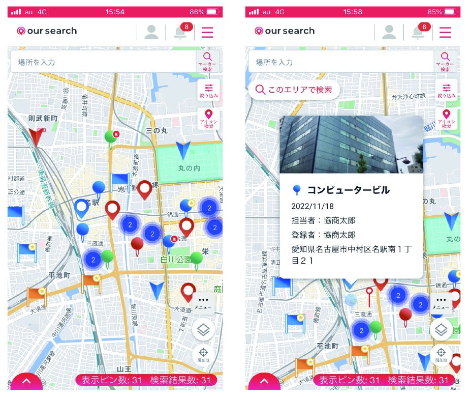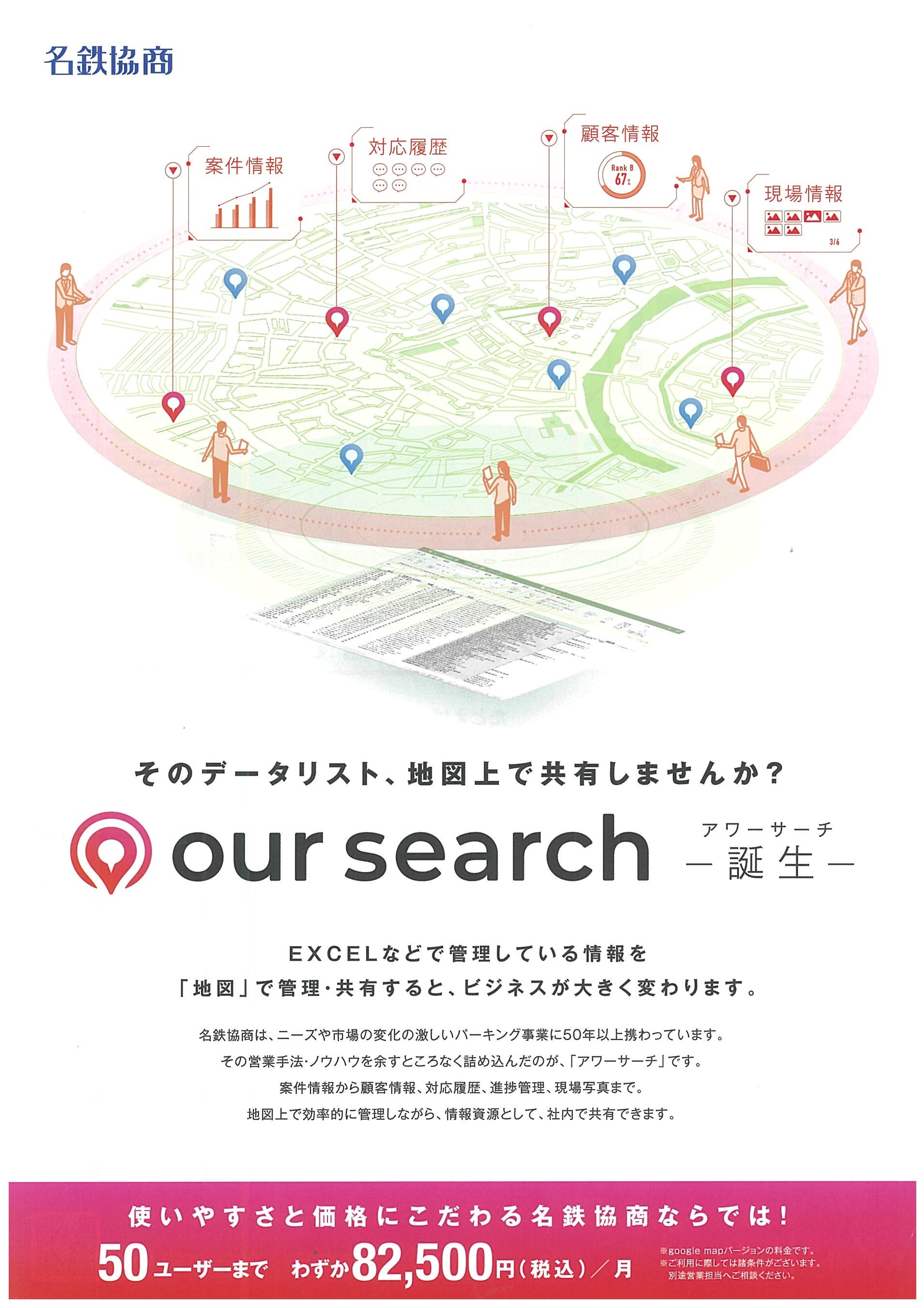 「our searchアワーサーチ」は、名鉄協商パーキングをはじめとするロケーションビジネスを行う当社が、実務で活用してきた物件管理地図システムをパッケージ化したものです。地図ソフト上で、案件情報から顧客情報、対応履歴、現場写真や契約書等のデータファイルまで、それぞれの地点に関連する情報をメンバー間でリアルタイムに登録・閲覧・管理できるクラウドサービスで、企業の営業活動はもちろん、災害など緊急時の被害状況の共有など、さまざまな用途で活用いただけます。