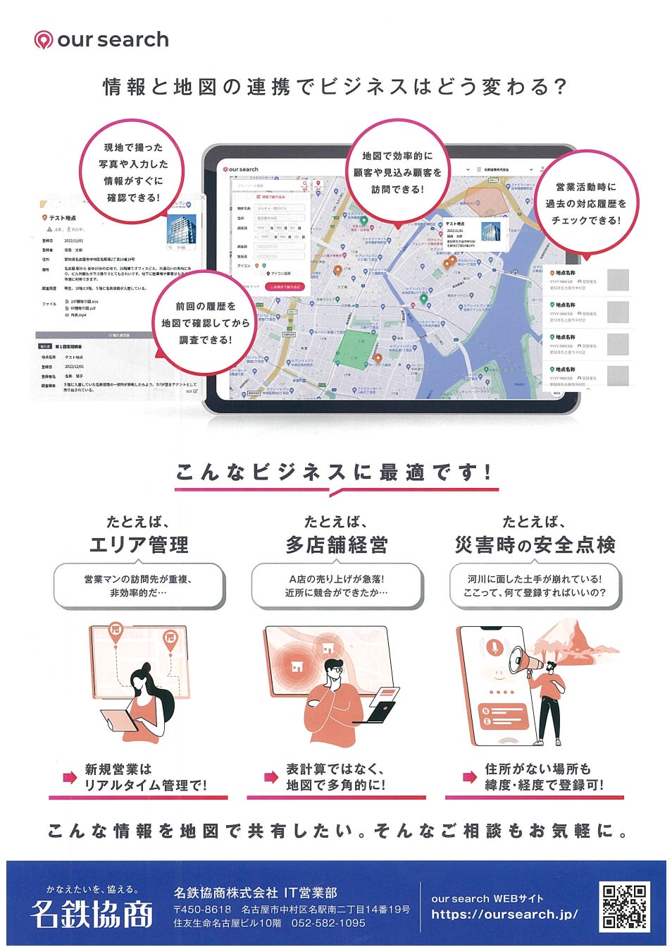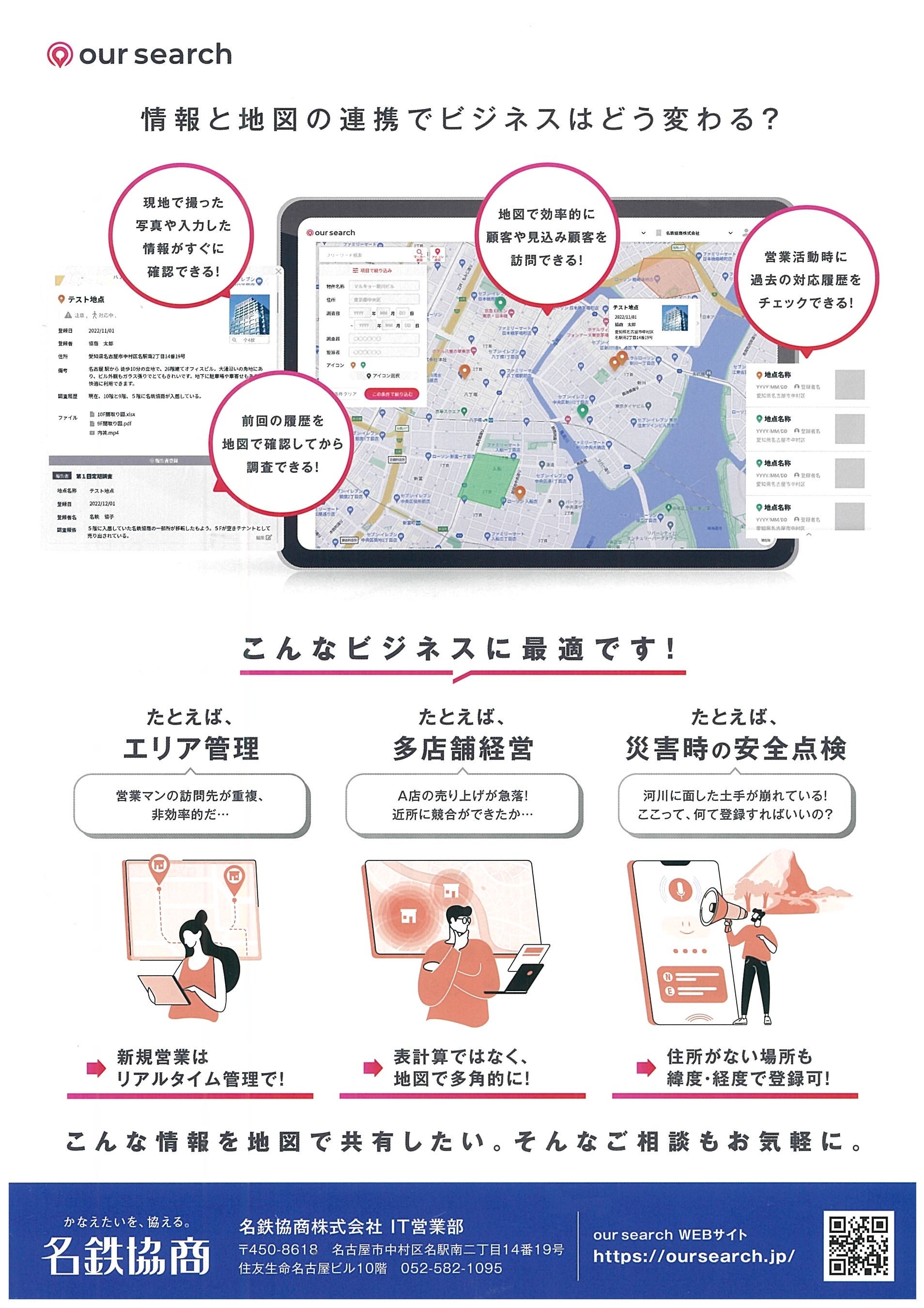 名鉄協商株式会社(本社:名古屋市中村区、代表取締役:小林 昌弘、以下当社という。)は、当社が「成長する企業のための手軽なDX」をコンセプトに展開するITソリューション「our seriesアワーシリーズ」の新たなラインナップとして、地物管理システム「our searchアワーサーチ」の販売を開始します。