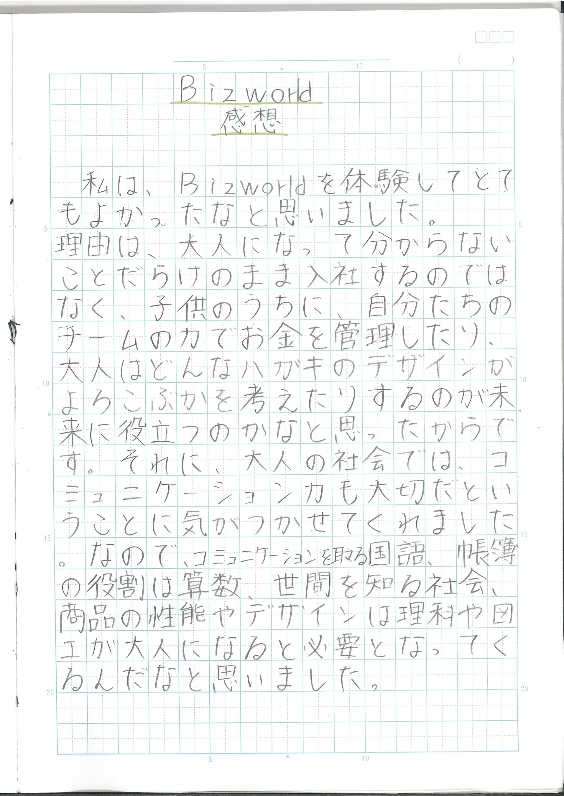 小学校の現場でこのプログラムを行うのは全国初めてということで、本当に小学生でも理解できる内容なのか不安な部分もありましたが、投資家へのピッチで会社や自社製品の良さを堂々とアピールする姿や、会社のオリジナルキャラクターや割引券を作るなど、自分たちで創意工夫する姿をたくさん見ることができました。「融資」や「利子」などの難しい言葉も、実際に体験する中で意味を理解できていたように思います。帳簿を書くことは少し難しく、6時間という短い活動時間の中では、価格設定をどうすればいいのか考える時間があまり取れなかったので、またこのような機会があればもっと時間をかけてプログラムに参加させていただきたいと思いました。