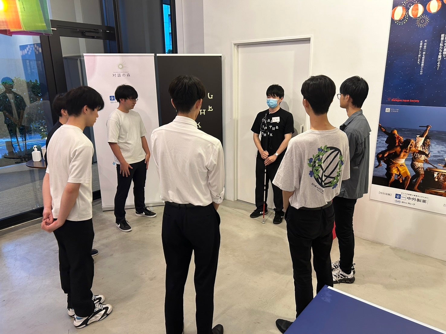 イベント当日、学生16名が東京・竹芝のダイアログ・ダイバーシティミュージアム「対話の森🄬」に集まりました。学生を2チームに分け、各チームがそれぞれ30分間の暗闇エンターテイメント「ダイアログ・イン・ザ・ダーク」を体験。完全に光を閉ざした“純度100%の暗闇”の中で、視覚障害者のアテンドにより対話やゲームを楽しみました。