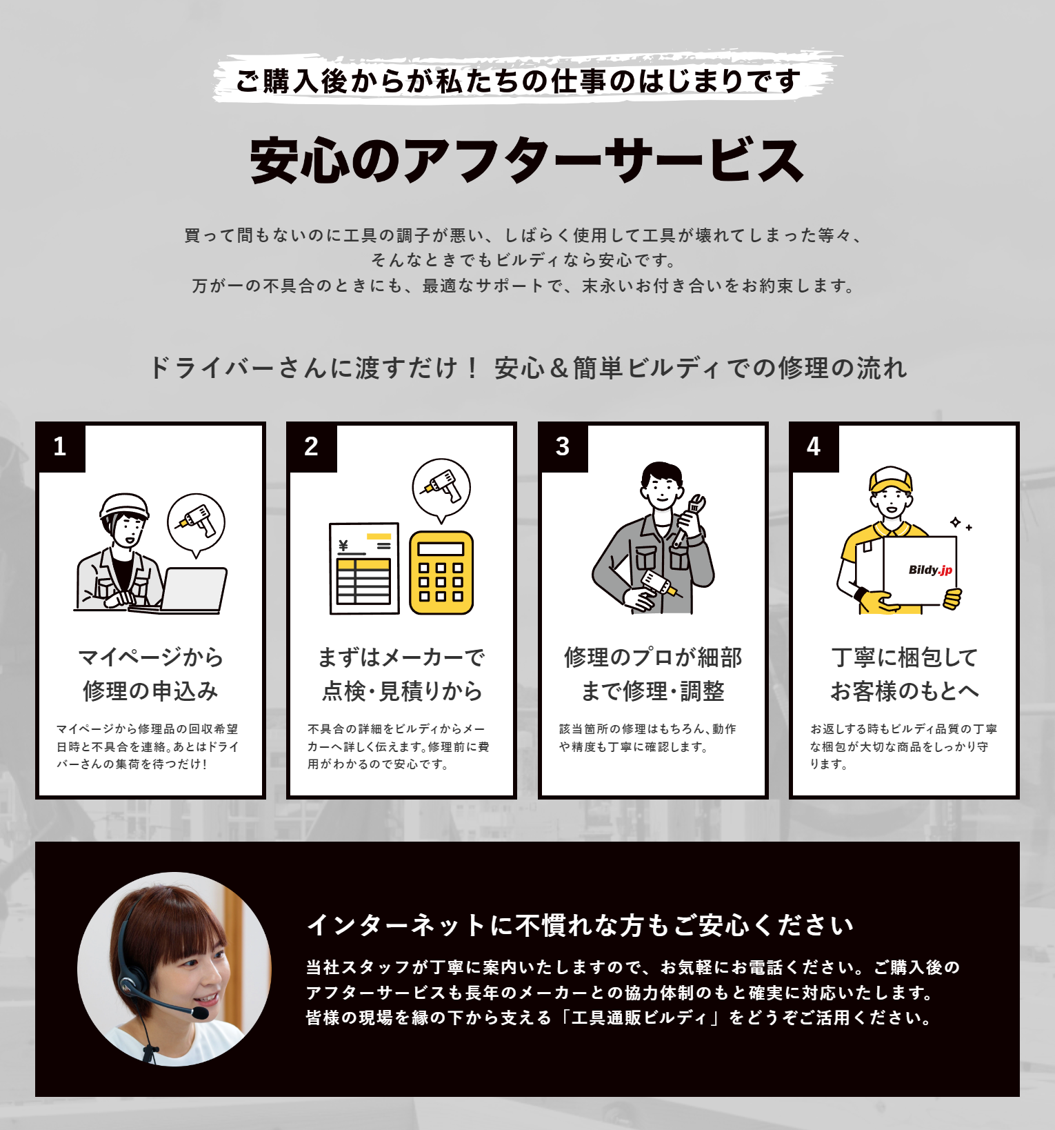 ビルディは「プロの現場を応援する」というサービス理念の基、創業当初からの現場に精通したノウハウを活かし、プロが求める豊富な品揃えや即日納品、丁寧なアフターサービスでお客さまの現場を支え続けられるよう引き続き取り組んでまいります。
