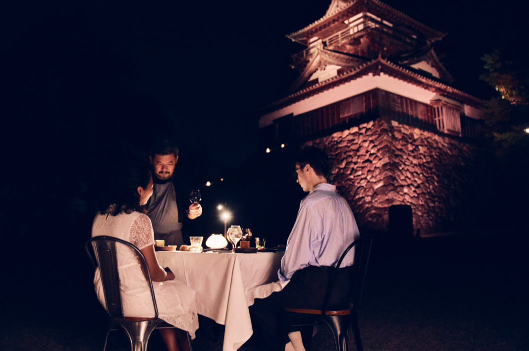 丸岡城で初の試み!城下の特設野外レストランでスペシャルディナー、天守閣での一筆啓上体験など、消滅の危機からよみがえった奇跡の城、重要文化財『丸岡城』を舞台に、特別な一夜を体感するツアー