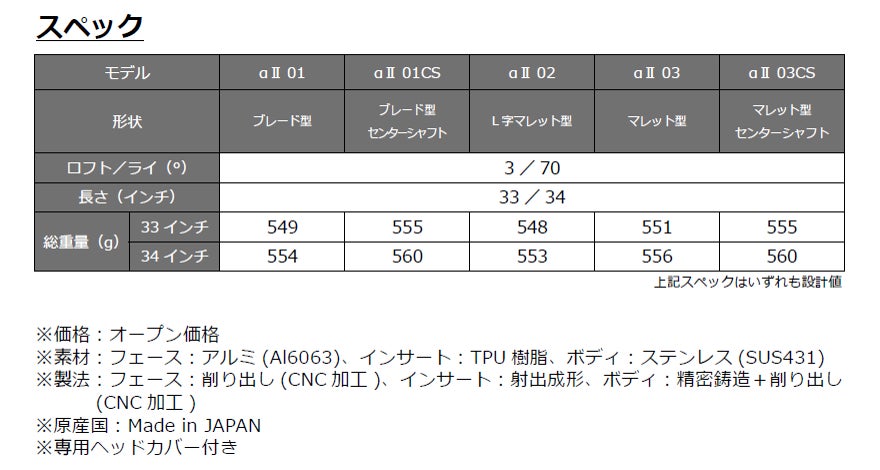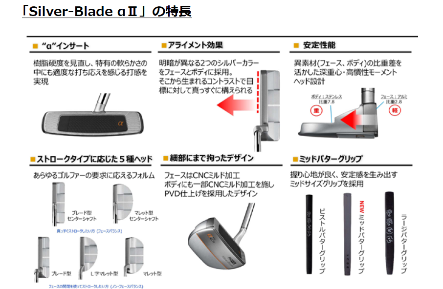 (株)プロギアは、「Silver-Blade( シルバー・ブレード)」パターから新シリーズ 「Silver-Blade αⅡ ( アルファ・ツー)」を5 月から発売します。ヘッドは全5 種類をラインアップし、あらゆるゴルファーのストロークタイプに対応します。