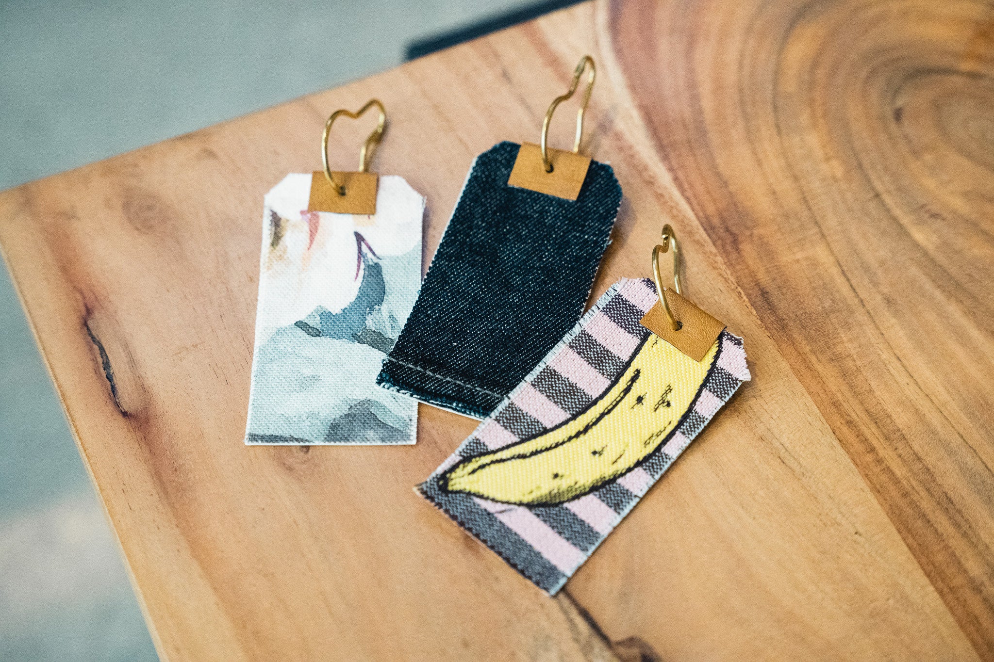 当社のインポートのカーテン生地や、ユニクロのデニム生地の中から好きなハギレを選び、台紙に貼り付けてネームタグをつくります。小さなお子様にも簡単にご参加頂けるワークショップです。当社の真鍮製フックを通してお使いいただけます。