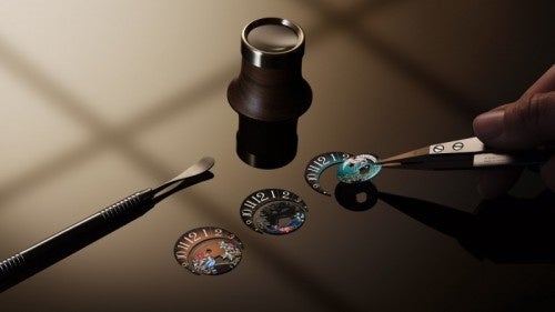 最初は目と手だけを頼りに、蒔絵の技法を模して、ゴールドのラッカーをきわめて小さいドット状に 塗布します(蒔絵とは日本の江戸時代に完成された技法です。漆が固まらないうちに金粉、または金 箔を蒔き、グラデーションを作ります)。次に、キャンバスに油絵を描く要領で、しかし非常に小さ なサイズで、一筆ずつ細く筆を動かして微細なイメージを形にします。このプロセスには 35~40時間もの時間がかかるため、忍耐力と高い集中力が求められる作業です。最後の仕上げとして、各イメージの一部を小さな金のパイヨン(金箔)で際立たせるため、慎重に施します。細部に至るまで実 物のように描かれた、見事な躍動感と奥行きが感じられるこれらの細密画は、職人の個性や情熱が吹 き込まれることで、ごくわずかながらそれぞれ違いが生まれます。最後に、半透明のラッカーを何層 にも施し、完成した絵を光沢と耐久性のある塗膜で封じ込めます。