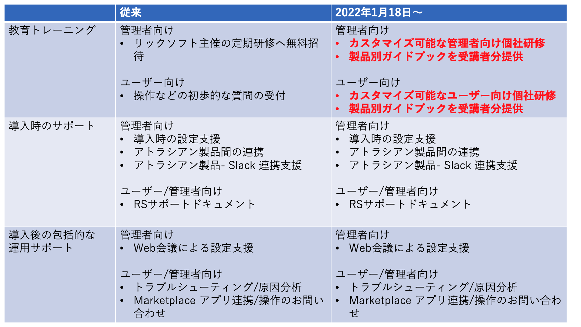 アトラシアン製品のクラウド版を利用するお客さまの運用をサポートする「サポートプラス」を発売して1年がたちました。そこで、さらにお客さまのご希望に添ったサポートを提供できないかと考え、この度従来の特典であった定期研修をセミオーダー型の個社研修へとグレードアップします。