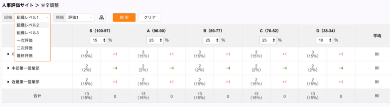 縦軸の選択は最大2つまで可能で、なおかつ選択種類も豊富です。例えば、部署、評価者、職種などの選択ができ、多方面で評価分布を確認や分析、より社内の基準に適した調整が可能になります。