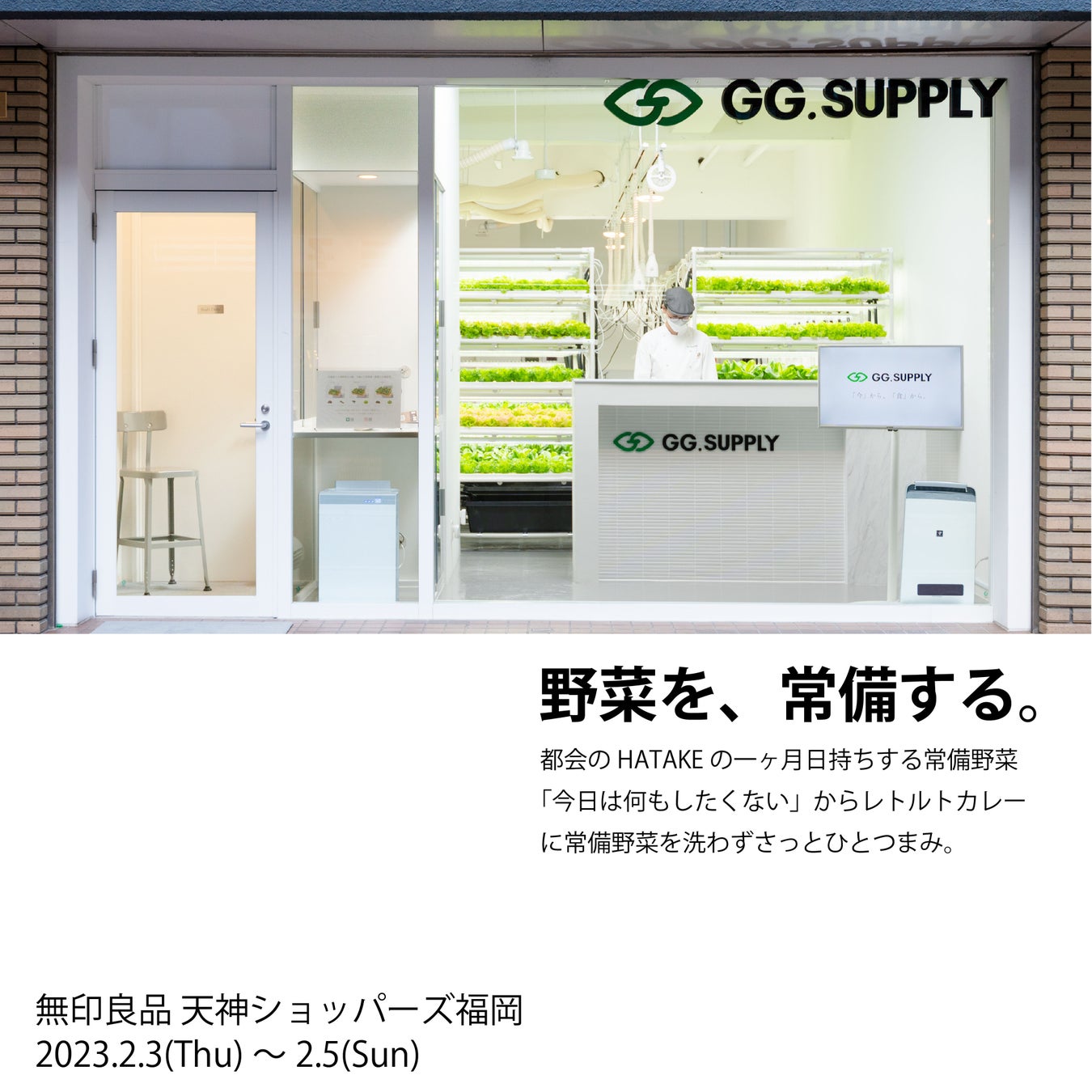 野菜の生産・販売事業を展開する、GG.SUPPLY株式会社 (本社:福岡県中央区、代表取締役:上杉 仁)の運営する、都会のHATAKE『GG.SUPPLY(ジージーサプライ)』は、2023年2月3日(金)~2月5日(日)無印良品 天神ショッパーズ福岡にて都会のHATAKE「洗わない常備野菜」と無印良品「温めるだけレトルト食品」の超時短料理の体験イベントを実施いたします。
