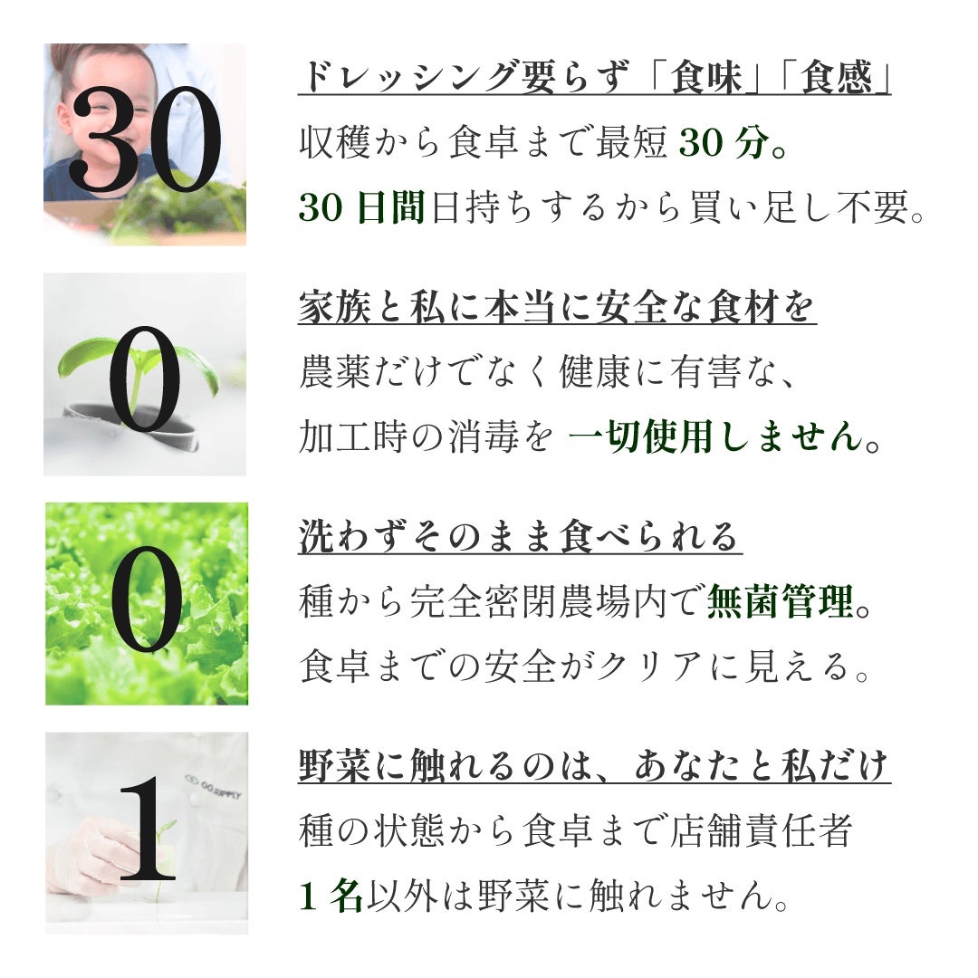 私達が毎日口にしている野菜は、収穫から10 日以上も経過していると言われています。食卓に運ばれるまでの工程で栄養素が失われるだけでなく、多くの雑菌に触れています。GG.SUPPLY はそんな現代の野菜物流の課題を解決するべく、郊外から都会に畑を持ってくることにより、収穫から30 分以内に野菜をデリバリーを可能にしました。