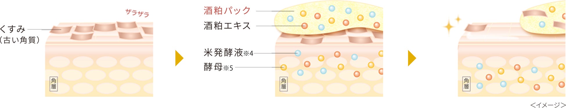 酒粕=酒粕エキス(保湿成分) ※1 古い角質 ※2 ユズ種子エキス(保湿成分) ※3 ユズ果皮油(エモリエント成分) ※4 コメ発酵液(保湿成分) ※5 加水分解酵母エキス(保湿成分) ※6 コメヌカスフィンゴ糖脂質(保湿成分)