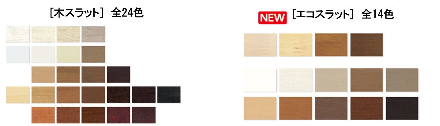 環境にやさしい集成材を使用した「エコスラット」14色を加え、全38色の充実したスラットラインナップになりました。毎日の暮らしを快適にする、多彩なスラットラインナップをそろえています。