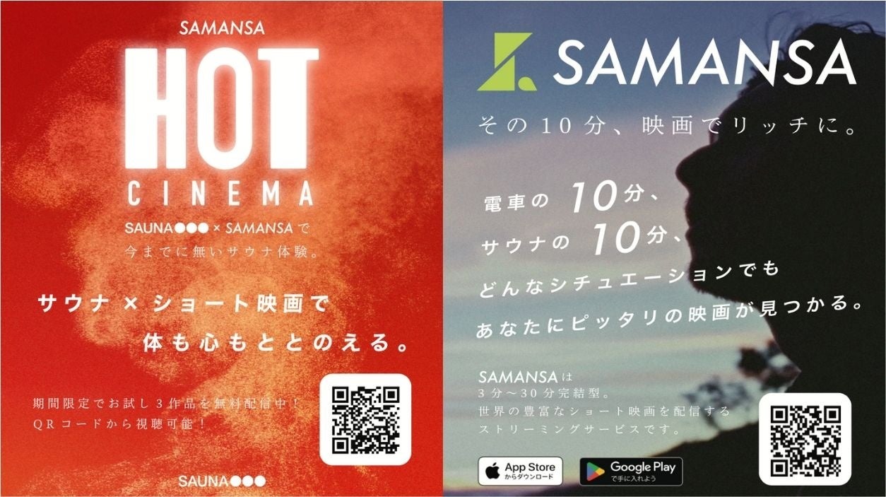 株式会社SAMANSAは、東京・大阪・福岡に店舗を持つプライベートサウナ施設「SAUNA OOO」とのコラボ企画をスタート。サウナ利用者は施設内のQRコードを通じてSAMANSAの人気作品を視聴でき、体も心もととのう体験を味わうことができる。今後もサウナ×ショート映画のように新しい体験を提供するため、様々なシチュエーションで映画を視聴できるようにしていく予定。