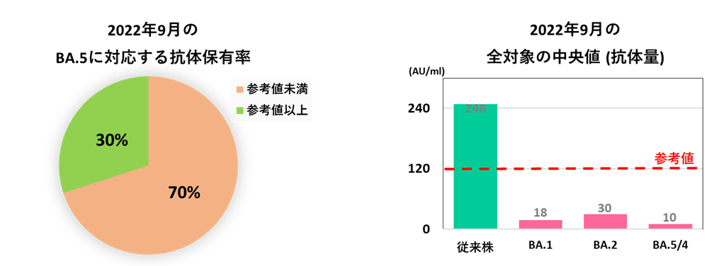 調査の結果、現在、流行中のオミクロン株BA.5に対する抗体保有調査の結果、2022年9月末時点で7割が十分な抗体保有量(参考値[※1]以上)を保有していないことが判りました。2022年9月末時点では、オミクロン株対応ワクチン接種は9月下旬に一般接種がスタートしたばかりでしたので、以下の様な結果になったと考えられます。