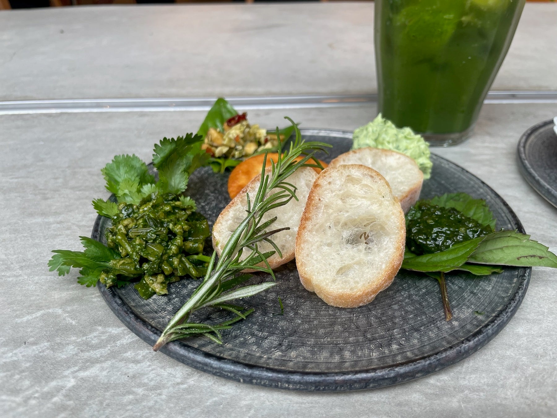 ・4種の抹茶&ハーブマリアージュソースに野菜スティックやバゲットを添えて