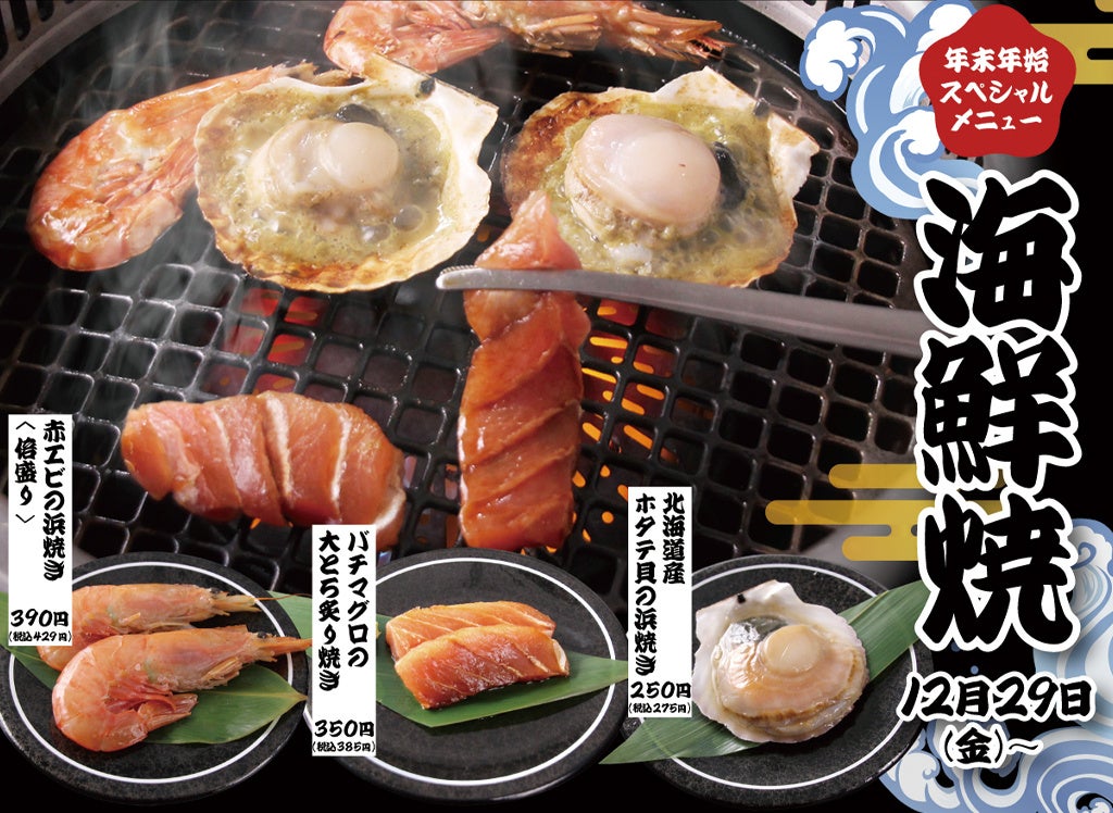 12月29日(金)から年末年始のご家族やご友人とのお食事を彩る新メニューとして、海の幸を炙ったり、焼いてお召し上がりいただく海鮮メニューを販売いたします。