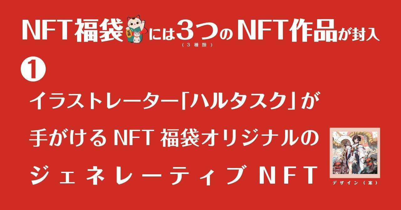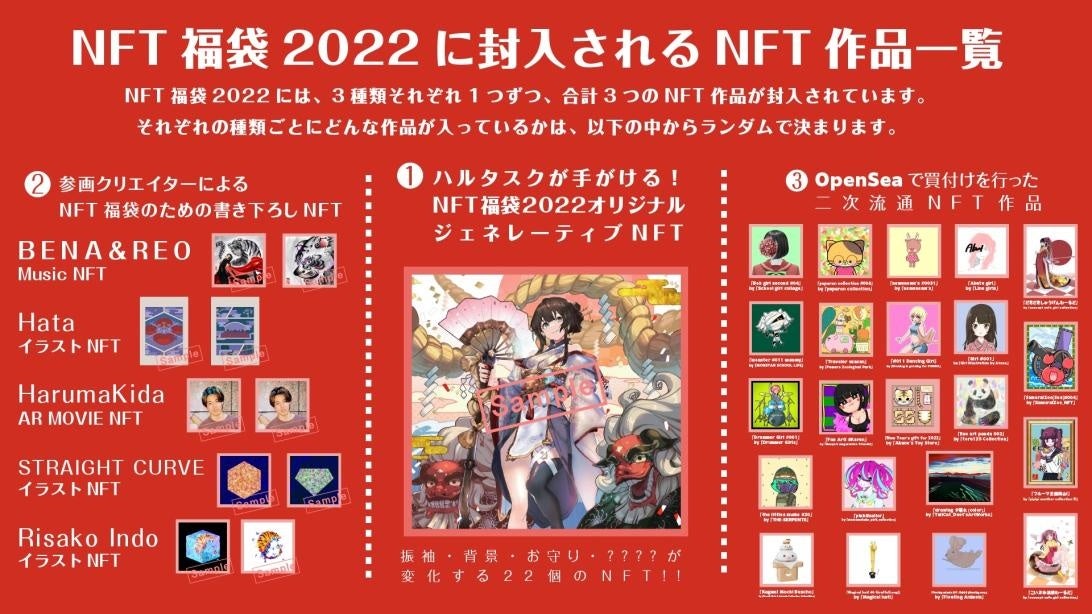 イラスト、音楽、日本画、ARフィルターなど各分野で活躍してる7名のクリエイターによる完全描き下ろしNFTアート。世界最大NFTマーケットプレイスOpenSeaで買付けを行った二次流通NFT作品。この2つを組み合わせたNFT福袋です。また日本円決済できるNFT福袋は国内初の試みです。